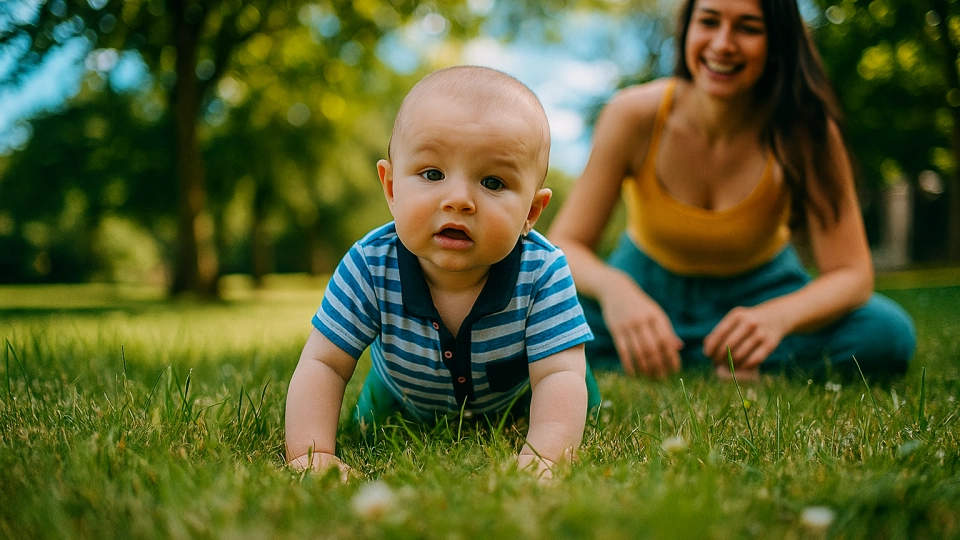 El verano es un periodo estupendo para el desarrollo natural de la motricidad del bebé. Para los bebés que empiezan a arrastrarse o gatear, el césped es un lugar idóneo: promueve los movimientos naturales del bebé, las hebras de la hierba estimulan los receptores cutáneos y el pequeño aprende a practicar los movimientos al aire libre.