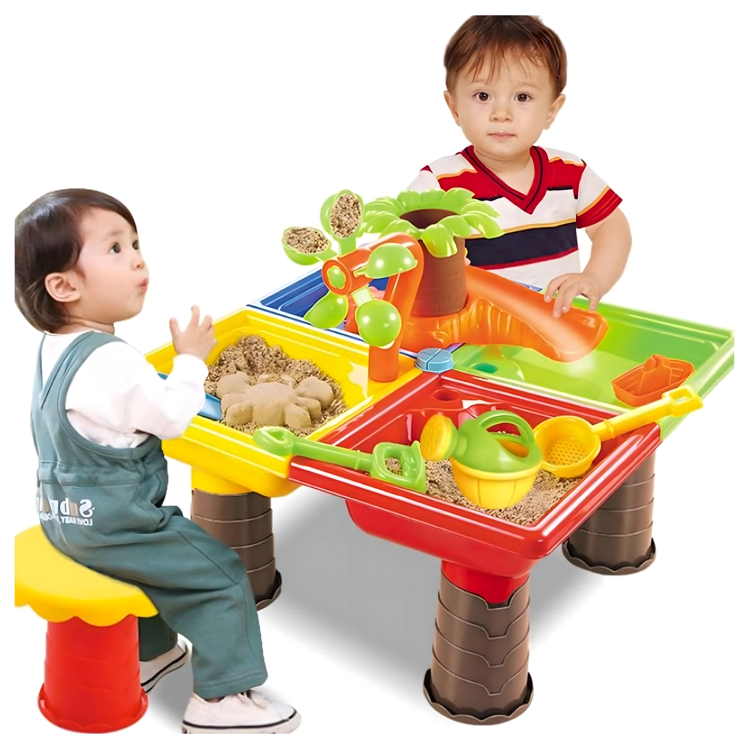 Seleccionamos las mesas de juego para exterior con énfasis en la seguridad y la resistencia. Materiales de calidad (plástico estabilizado UV, madera robusta) y una estructura estable con bordes redondeados garantizan un juego cómodo y seguro. Detalles prácticos como tapa antipolvo, válvula de drenaje en las mesas de agua, bandejas extraíbles, patas regulables en altura y espacio de almacenamiento facilitan el mantenimiento sencillo y el uso diario. Gracias al montaje rápido, el bajo peso y la resistencia a los rayos UV, la mesa de juego se transporta fácilmente y ofrece una larga vida útil incluso a pleno sol. ¿Cómo elegir la mesa de juego ideal para niños? Ten en cuenta la edad y la estatura del niño (prioriza una altura ergonómica), el espacio disponible, el tipo de juego (arena, agua o combinado), el material y los accesorios. Son populares los juegos con accesorios: mesa infantil con accesorios, moldes, molinos, regaderas y canales para corrientes de agua, que potencian la creatividad, la imaginación y el pensamiento lógico. Las mesas de juego infantiles para exterior son prácticas para jardín, terraza y balcón; en temporada ofrecen juego sensorial con agua y arena y, fuera de temporada, sirven como mesa multifuncional de trabajo y creatividad.