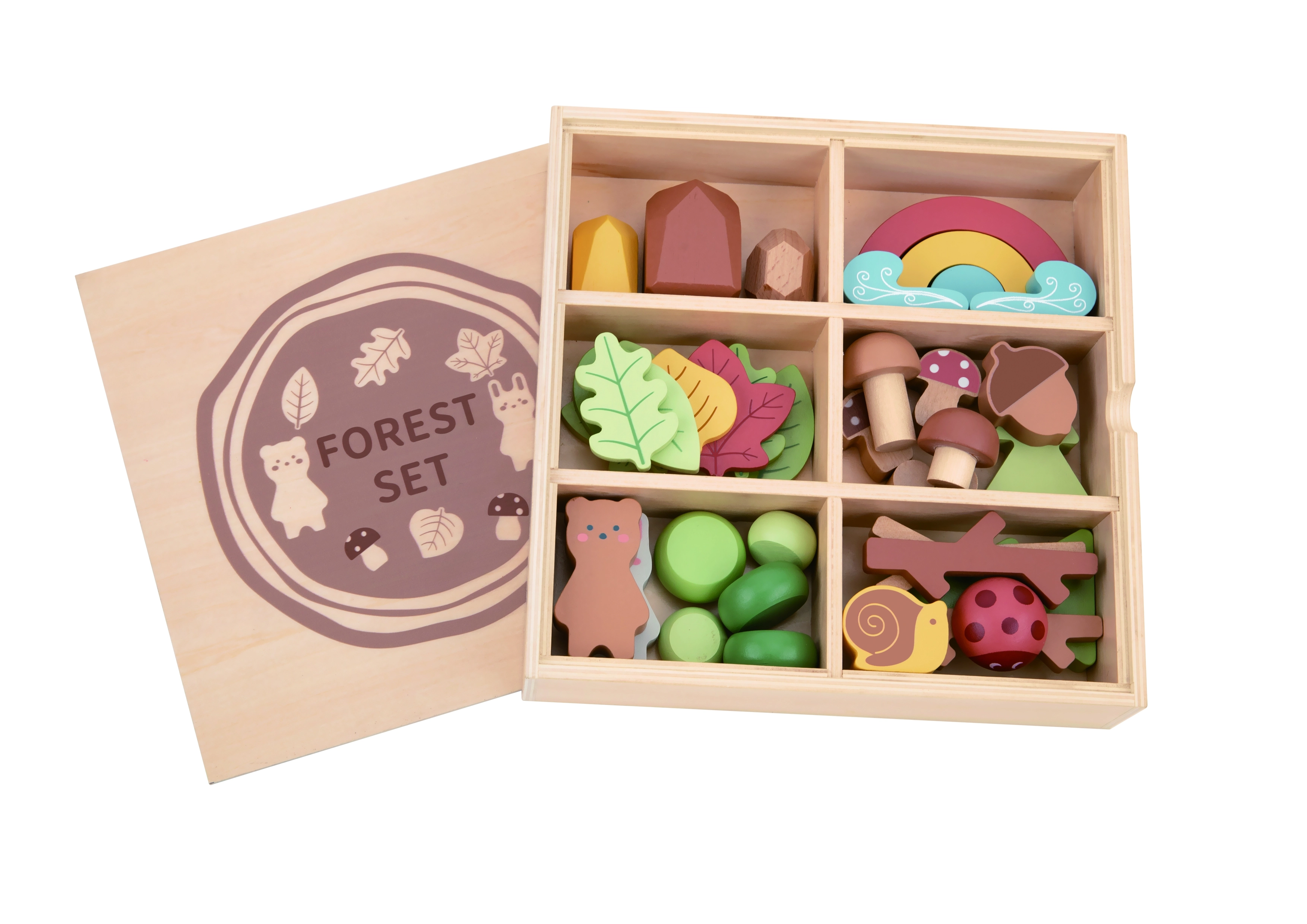 Entre en un mundo de historias donde las figuras de madera cobran vida y los sets de juego de madera despiertan la imaginación infantil. Las figuras de madera de animales, personajes y vehículos fomentan el juego abierto y el juego de roles, desarrollan la imaginación, el vocabulario y la narración de historias. Los sets de juego temáticos (granja, ciudad, zoo, bosque) y los conjuntos de figuras ofrecen combinaciones infinitas de historias y encajan a la perfección con otros juguetes de madera.