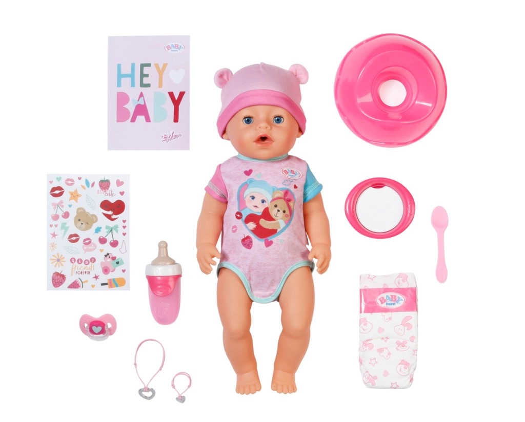 El tamaño más habitual es la muñeca de 43 cm: bebe del biberón, hace pis en el orinal, puede llorar con lágrimas y se puede alimentar con papilla; algunos modelos son aptos para el baño. Las extremidades articuladas, el cuerpo agradablemente blandito y la alta calidad de fabricación facilitan el vestido y un juego más realista. Completa la diversión con amplios accesorios y ropita BABY born: biberones, chupetes, pañales, orinales, bañeritas, cochecitos, cunas, portabebés y sets de comida temáticos.
