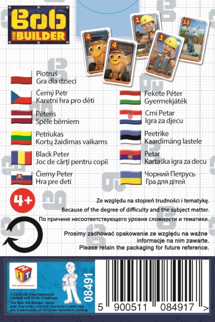 Juego de cartas para niños con el popular personaje Bob el Constructor. Los jugadores reparten las cartas e intentan formar parejas. Un juego alegre que ejercita la atención y ofrece diversión para toda la familia.