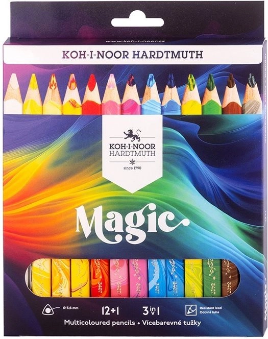 Los lápices KOH-I-NOOR Magic son ideales para dibujo creativo, sombreado y rayado. Gracias a su núcleo único, crean trazos multicolor que pasan suavemente de un tono a otro, aportando a los dibujos un aspecto 3D con volumen. La forma ergonómica triangular garantiza un agarre cómodo y un mejor control durante el trabajo.