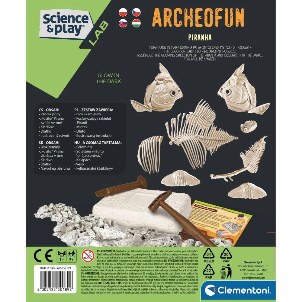 Conviértete en un pequeño paleontólogo y descubre el esqueleto de un pez depredador: ¡la piraña! Este divertido set arqueológico de la marca Clementoni permite a los niños, con las herramientas incluidas, “extraer” con cuidado la fósil y montar un esqueleto de piraña que brilla. Siguiendo las instrucciones ilustradas, conocerás más sobre las fósiles, su formación y dónde viven hoy las pirañas. Una gran opción para desarrollar la destreza, la creatividad y el interés por la ciencia.
