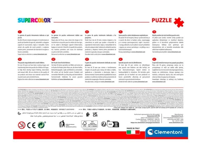 Rompecabezas infantil de 104 piezas con el motivo de BARBIE en una forma original que ofrece un montaje divertido y un resultado hermoso con dimensiones de 48,5 × 33,5 cm. La impresión de alta calidad, los efectos especiales de superficie y las piezas cortadas con precisión de materiales reciclados garantizan una gran experiencia y durabilidad. Fabricado en Italia.