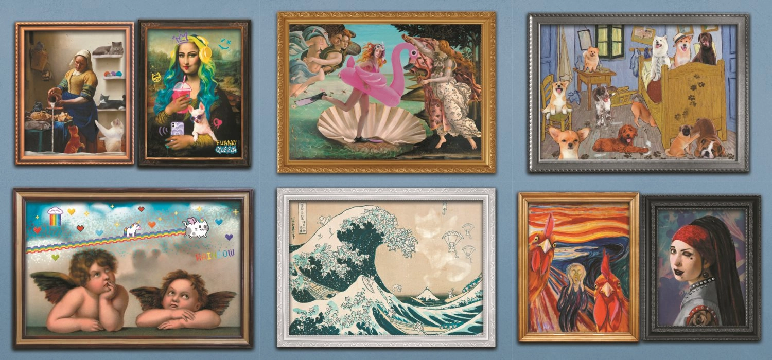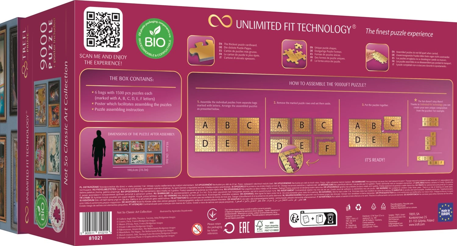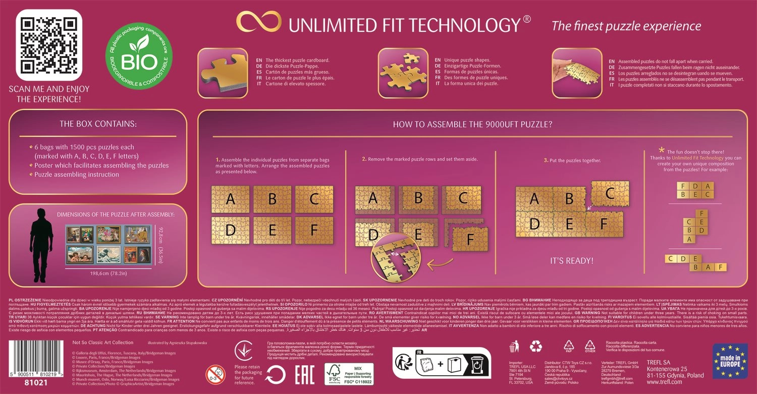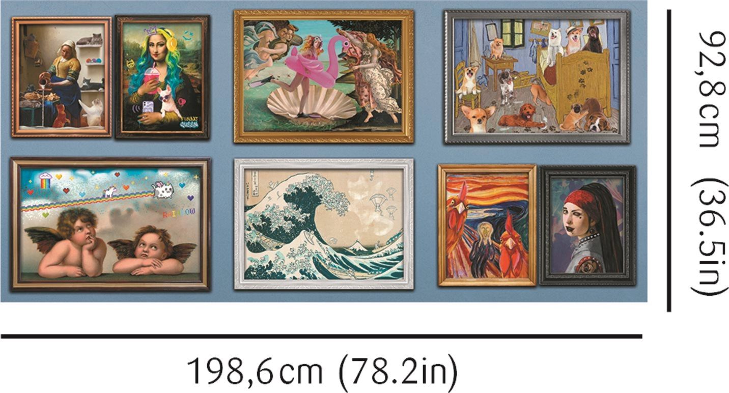 Seis rompecabezas de 1500 piezas cada uno pueden unirse para formar una imagen gigante según el póster incluido, o puede dar rienda suelta a la imaginación y crear su propia composición.