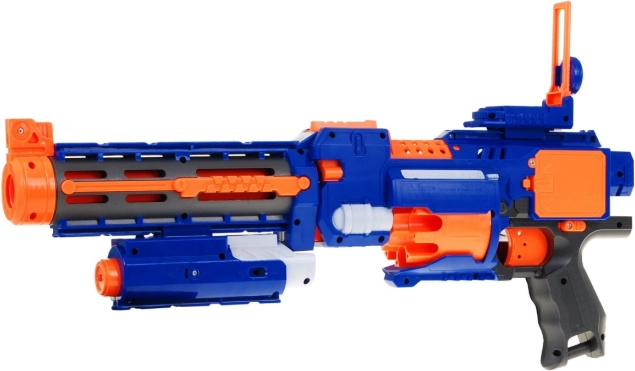 Aprieta el gatillo y el bláster dispara dardos de forma continua a una velocidad de hasta 3 por segundo. La propulsión la proporciona un compresor eléctrico alimentado por 3× AAA (no incluidas).