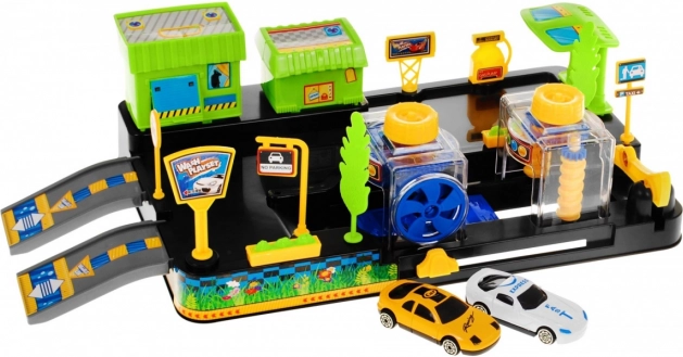 En la caja encontrarás 2 cochecitos, rampas, barreras, señales y decoraciones, incluida una gasolinera y un mercado/restaurante.