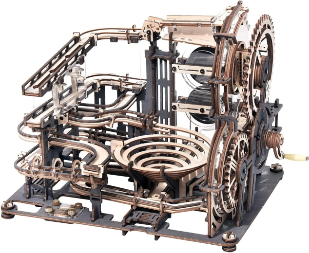 El rompecabezas incluye un detallado sistema de engranajes y pistas que ofrecen una vista de la mecánica accionada a mano.