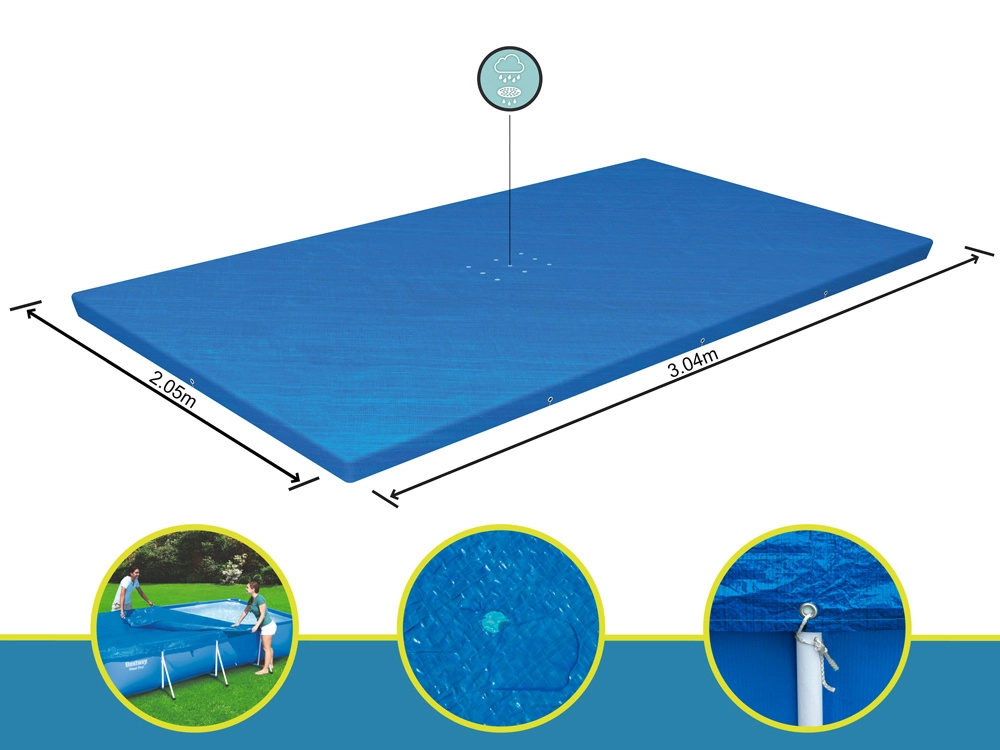 La cubierta está diseñada para proteger su piscina rectangular con marco de 300 x 201 cm. Los orificios de drenaje especiales en la cubierta evitan la acumulación de agua. Gracias a las correas integradas, puede fijar la cubierta de forma sencilla y segura a la estructura de la piscina.