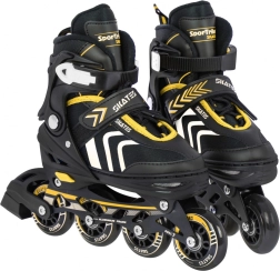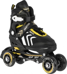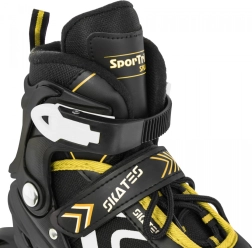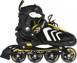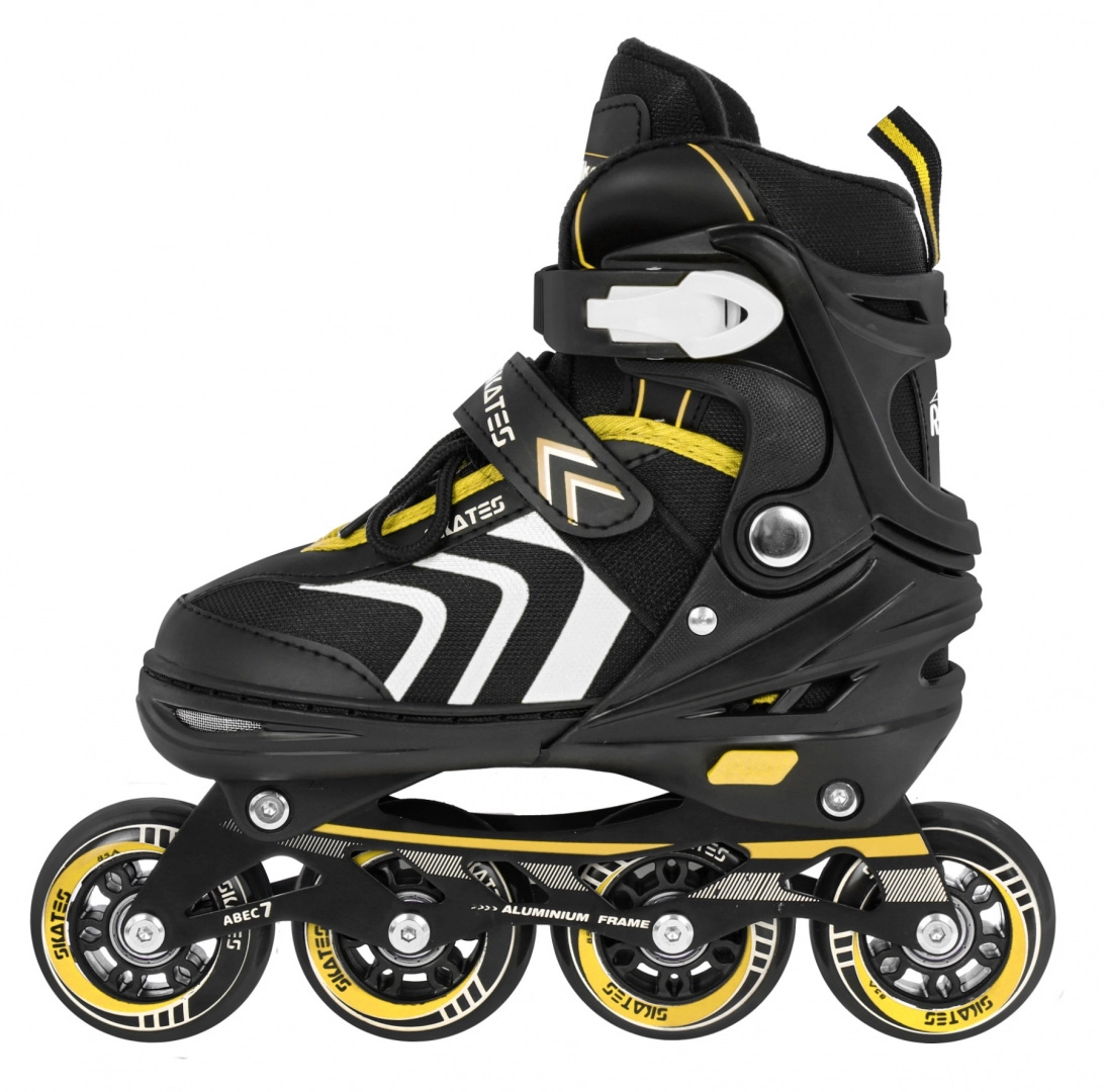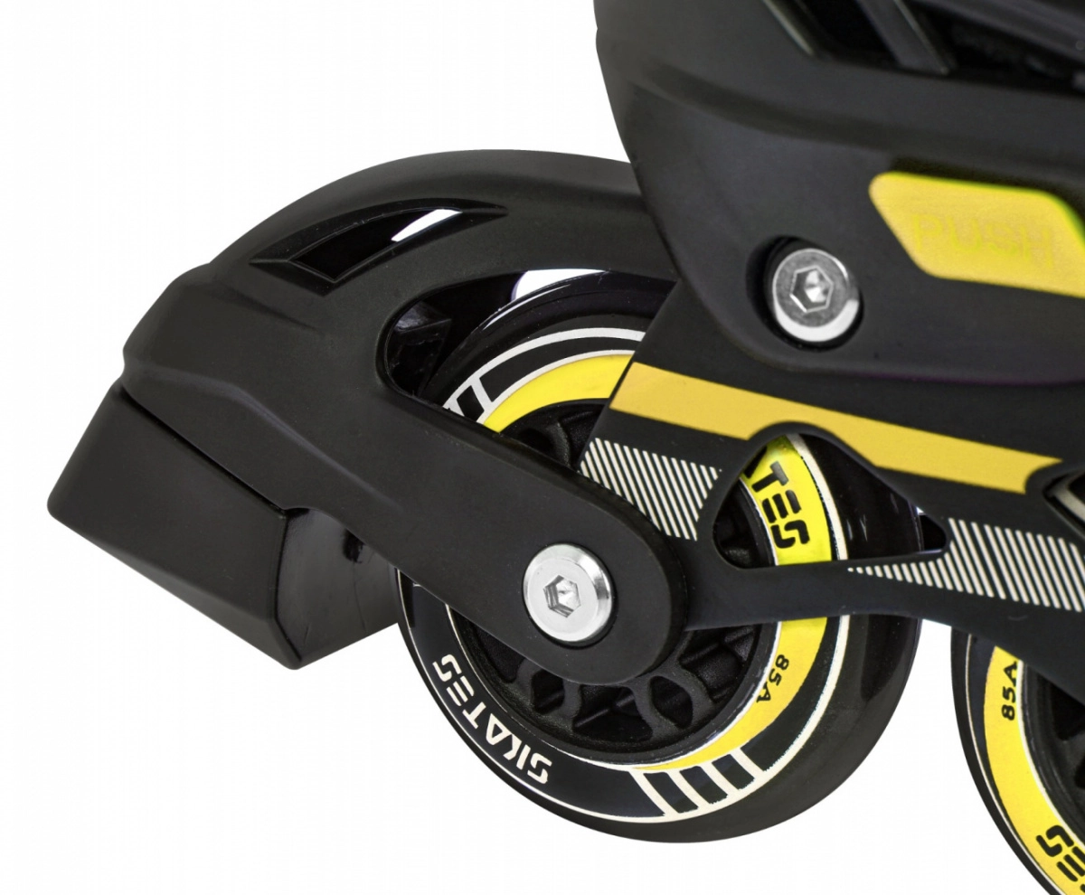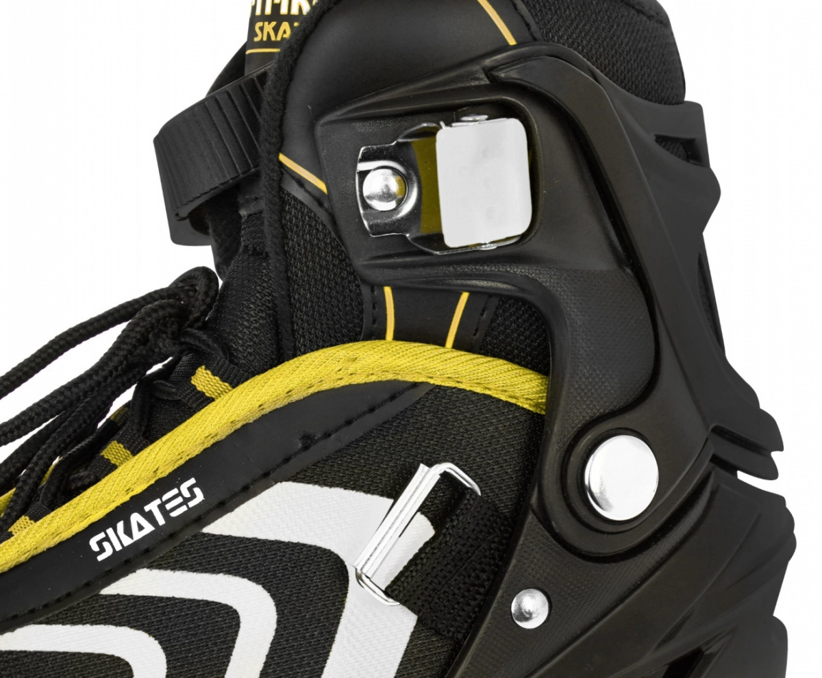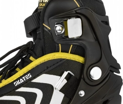 La bota incluye ventilación eficaz, membrana semipermeable y plantilla perfilada con espuma EVA recubierta de material aterciopelado Velvet. El cierre triple (cordones, tira de velcro y hebilla con bloqueo) mantiene el pie estable. El chasis de aluminio con ruedas de PU 70×24 mm, dureza 85A y rodamientos ABEC‑7 ofrece una conducción fluida y rápida; el patín derecho incorpora freno.