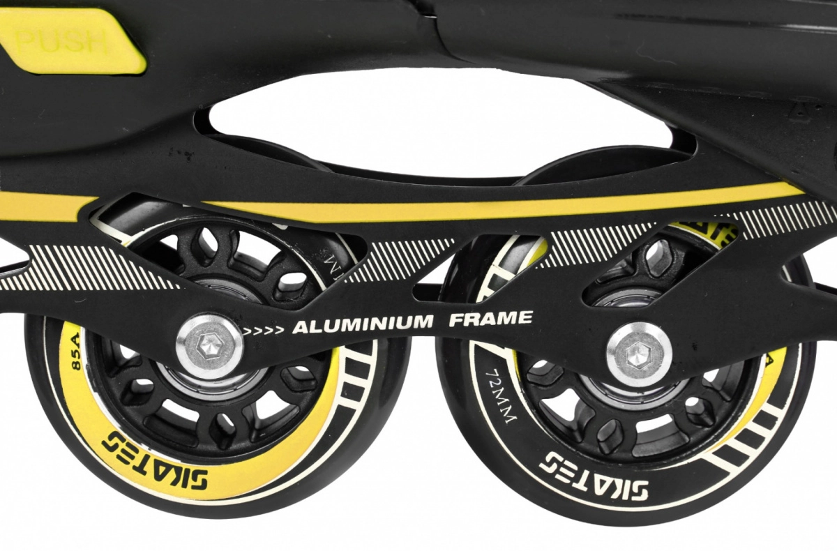 Un deslizamiento suave está asegurado por ruedas de PU 72x24 mm con dureza 85A, precisos rodamientos ABEC-7 y un robusto bastidor de aluminio. Para uso en invierno, basta con cambiar los chasis por cuchillas de acero inoxidable. El interior de la bota es cómodo gracias a la espuma EVA, la plantilla anatómica, la membrana semipermeable y la ventilación.