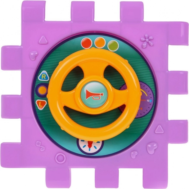 Elementos interactivos para entrenar el agarre y la coordinación: gira el volante, levanta el teléfono, abre la puertita con la llave y descubre la recompensa por el procedimiento correcto.