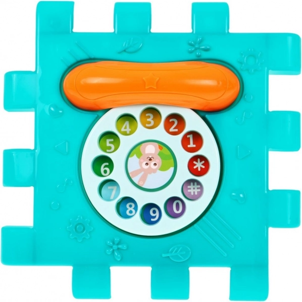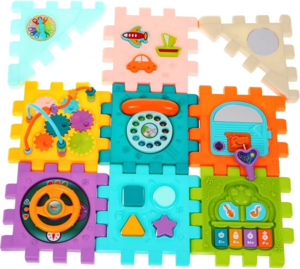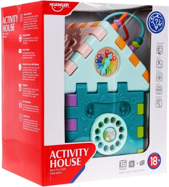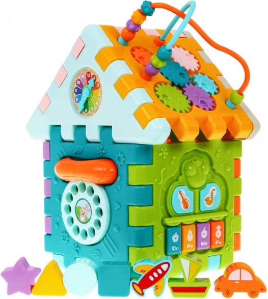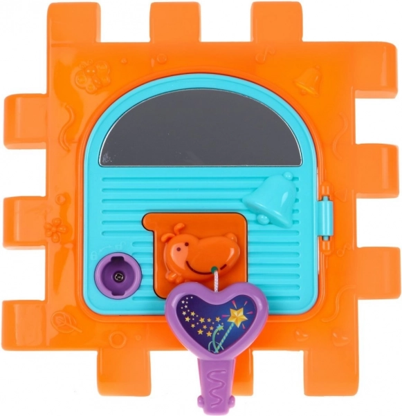 Esta colorida casa multidimensional puede montarse en diferentes formas o desplegarse como una alfombrilla de juego plana. Gracias a los efectos de luz y sonido del pianito (alimentación 3× AAA, no incluidas) favorece el desarrollo del oído y la vista, mientras que los elementos mecánicos —volante, teléfono, puertita con llave y ruedas dentadas— entrenan de forma excelente la motricidad fina y la coordinación.
