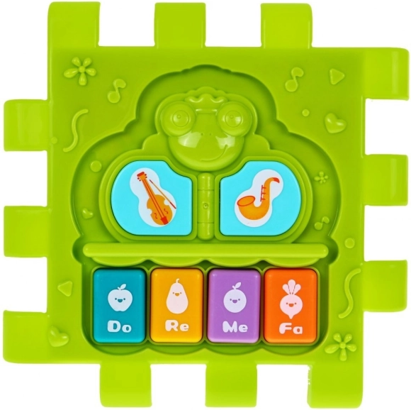 El panel verde brillante con botones “Do–Re–Mi–Fa” estimula el oído, el ritmo y la vista gracias a los efectos luminosos. Ideal para las primeras exploraciones musicales.