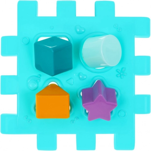 Diferentes aberturas y piezas correspondientes (estrella, cuadrado, triángulo, círculo, cochecito, avión, barquito) enseñan a reconocer formas y desarrollan la motricidad fina.