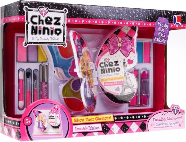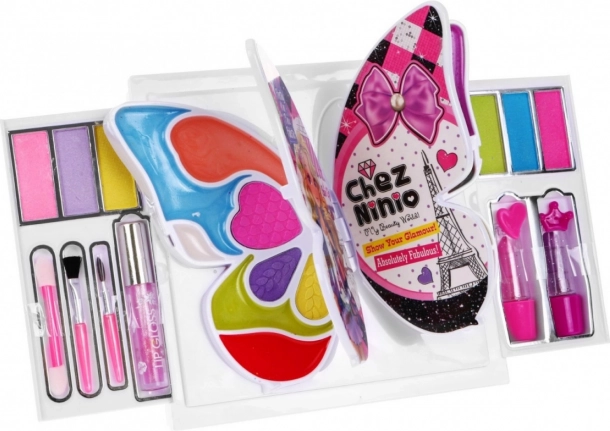 - estuche de mariposa; 2× barra de labios; brillos de labios de colores; sombras de ojos de colores; brochitas; 2× espejo