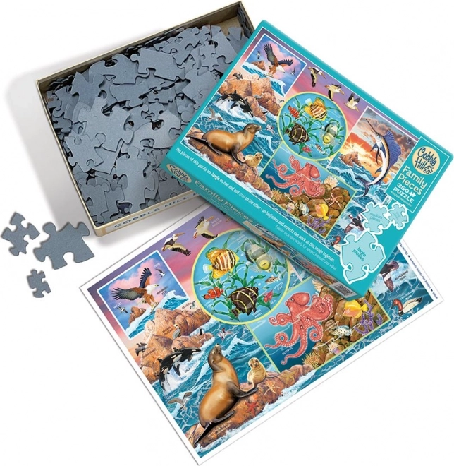 Disfruta armando en familia el rompecabezas COBBLE HILL – Magia del océano de 350 piezas. El empaque único combina tres tamaños de piezas para niños, padres y abuelos, de modo que todos encuentren su nivel. El troquelado irregular especial aumenta la diversión y el desafío, mientras que el generoso formato de 67,6 × 48,9 cm garantiza una imagen final impresionante.