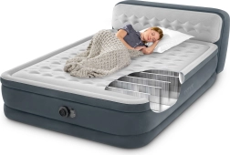 La bomba eléctrica integrada permite un inflado y desinflado rápidos y sin esfuerzo. La agradable superficie de terciopelo es suave con la piel y mejora la sujeción de la sábana. El cabecero inflable integrado proporciona apoyo para leer y descansar. La cama se entrega con bolsa de transporte y parche de reparación.