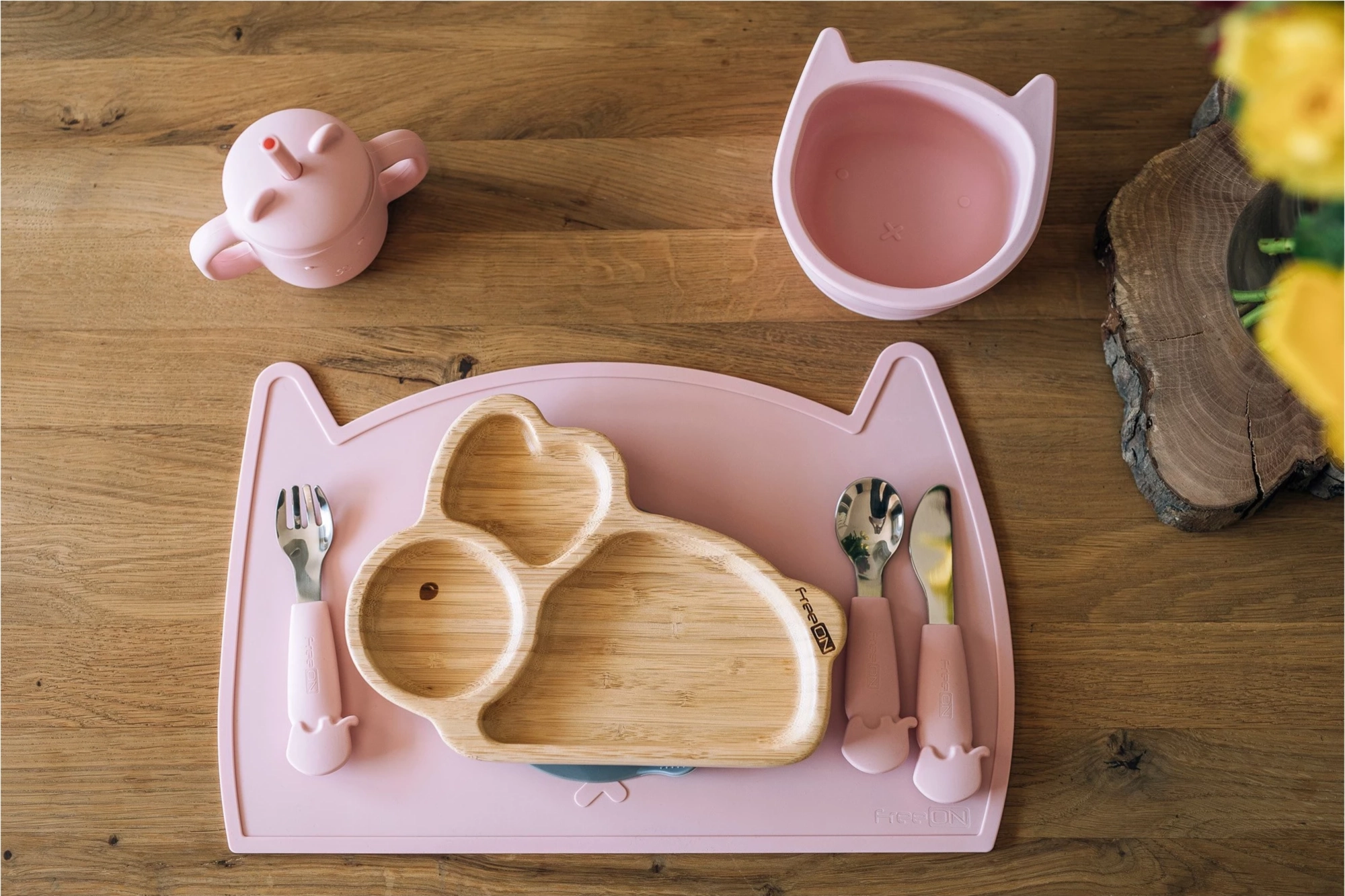 Adorable plato infantil con forma de conejito, fabricado en bambú de alta calidad con ventosa desmontable para una sujeción firme a la mesa. Cuenta con 3 compartimentos para un servicio organizado, materiales seguros sin BPA, PVC, ftalatos ni melamina y fácil mantenimiento.