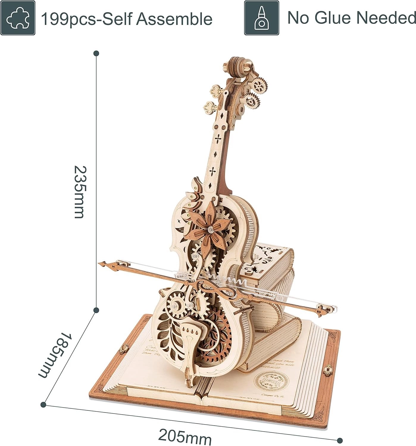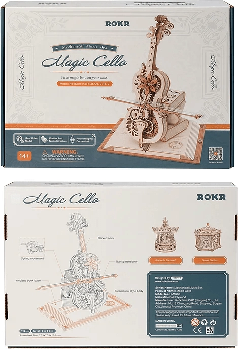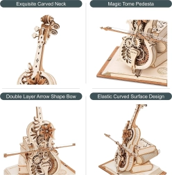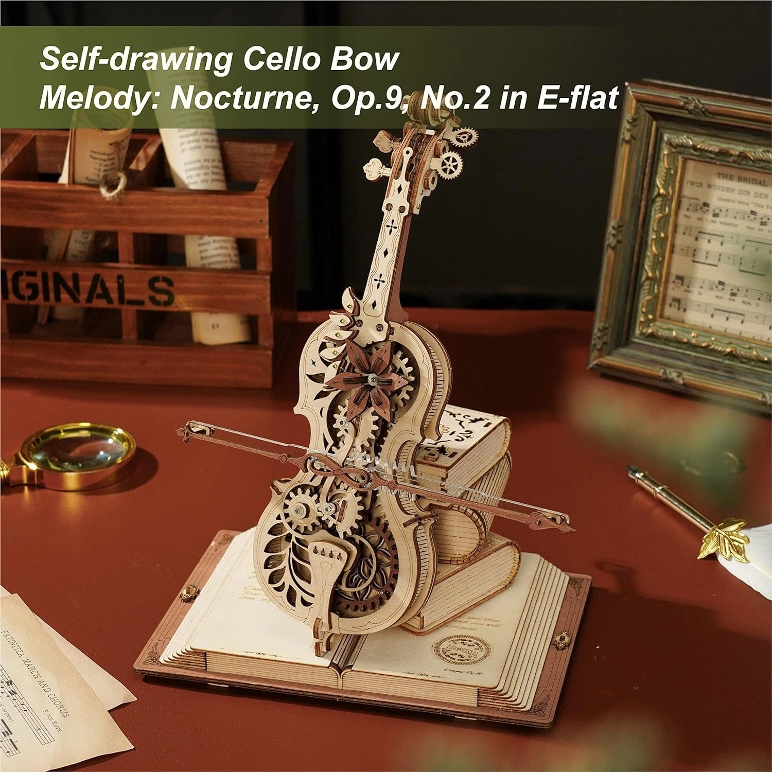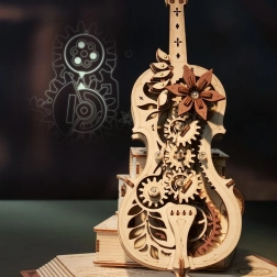 El elegante modelo de violonchelo sobre una base de tres libros destaca por su aire romántico y retro, con patrones clásicos europeos. Las piezas de madera y metal, cortadas con precisión, encajan a la perfección y, al dar cuerda, suena la célebre melodía del Nocturno, Op. 9 n.º 2 (Mi bemol mayor), mientras el arco se desplaza suavemente de un lado a otro. El resultado es una encantadora fusión de música y mecánica que luce en cualquier interior.