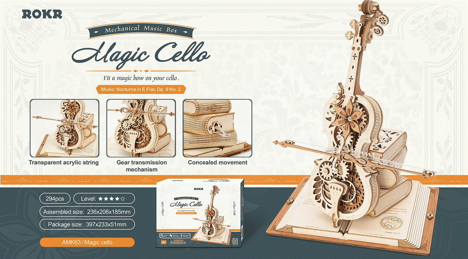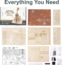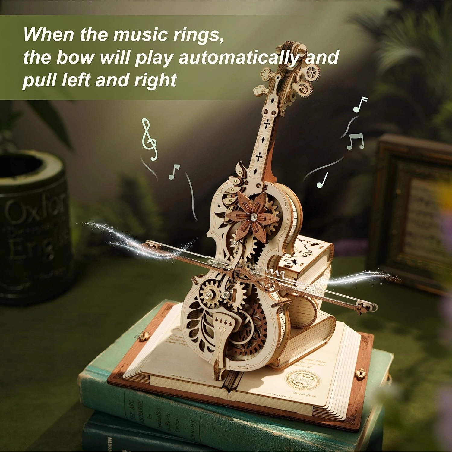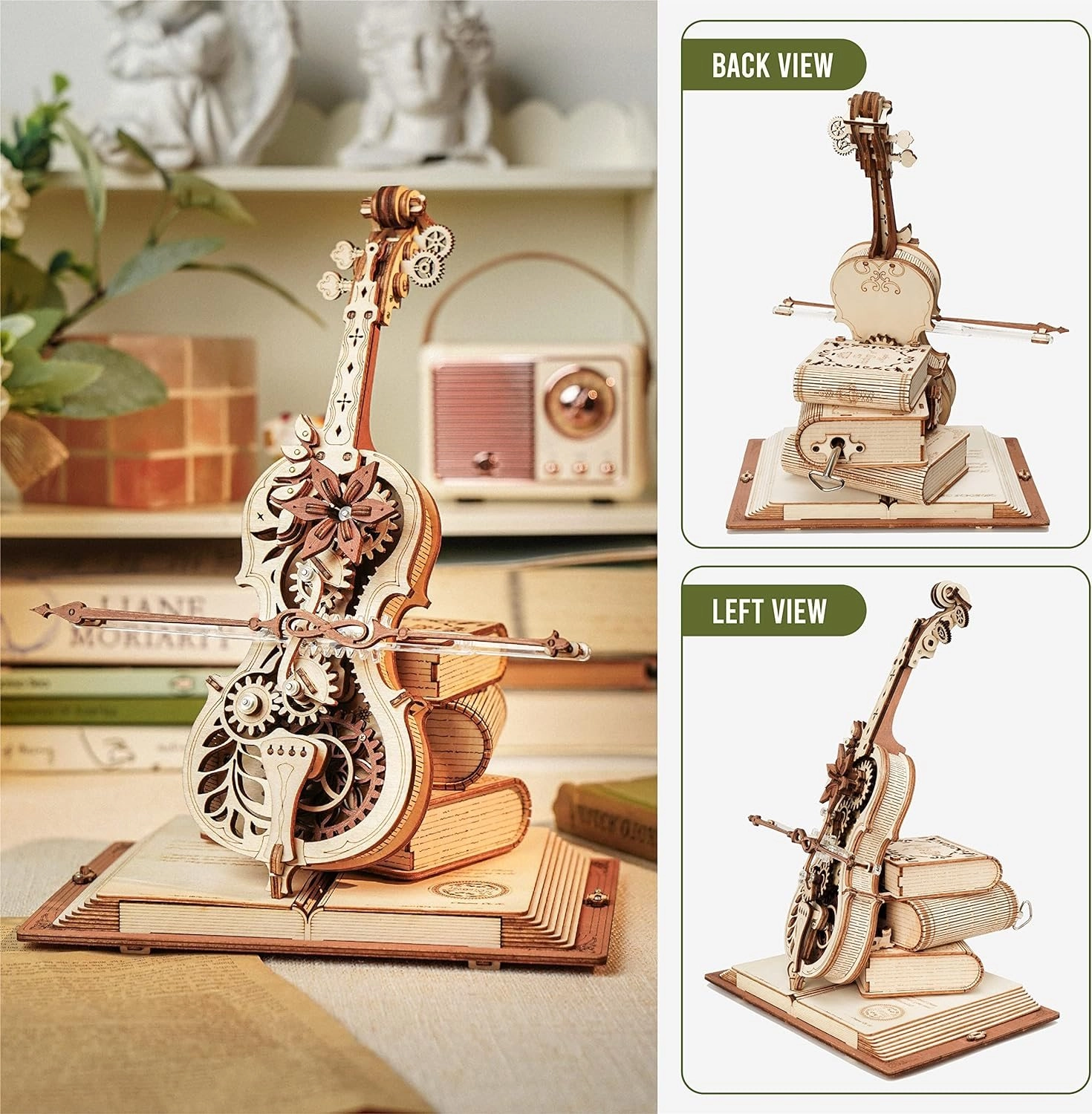 El elegante modelo de violonchelo sobre una base de tres libros destaca por su aire romántico y retro, con patrones clásicos europeos. Las piezas de madera y metal, cortadas con precisión, encajan a la perfección y, al dar cuerda, suena la célebre melodía del Nocturno, Op. 9 n.º 2 (Mi bemol mayor), mientras el arco se desplaza suavemente de un lado a otro. El resultado es una encantadora fusión de música y mecánica que luce en cualquier interior.