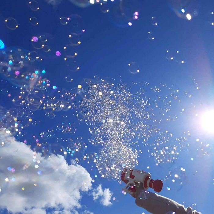 La boquilla múltiple crea al instante decenas o incluso cientos de burbujas. Solo hay que mojar la cabeza en la solución y presionar el gatillo — sin soplar y sin esfuerzo.