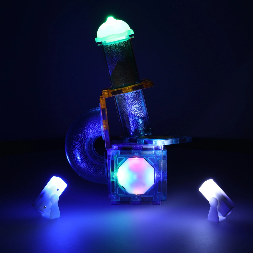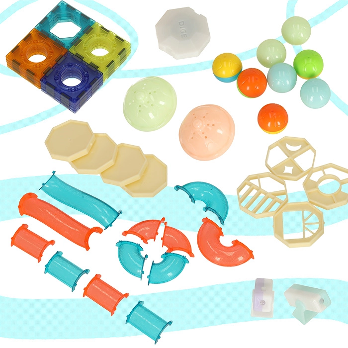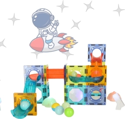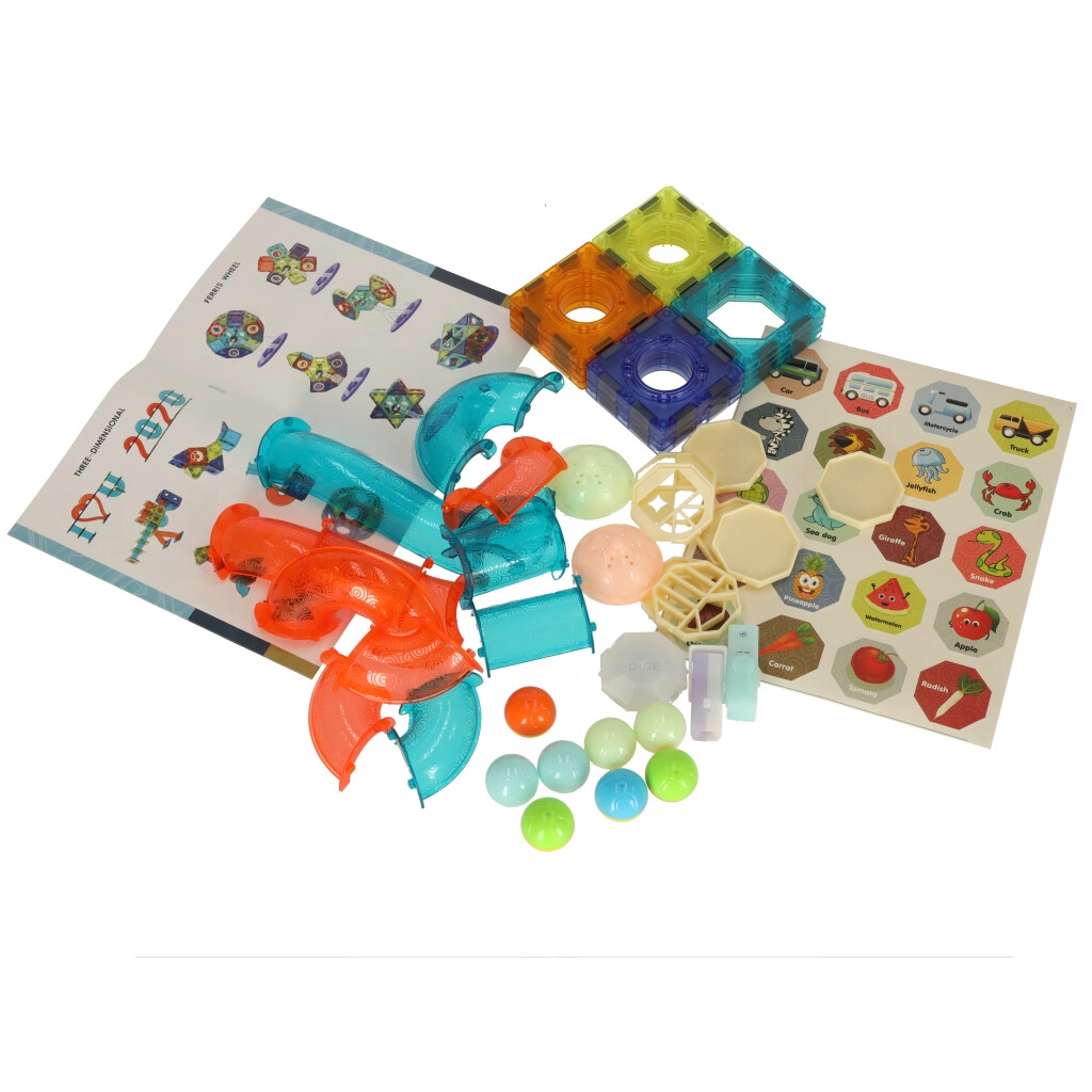 El set permite construcciones versátiles en 2D y 3D: desde formas sencillas hasta circuitos complejos. Los cuadrados magnéticos garantizan una estructura estable, mientras que los tubos y túneles se insertan fácilmente “a clic”. Gracias a las piezas y canicas luminosas, cada descenso se convierte en un espectáculo divertido y visualmente atractivo.