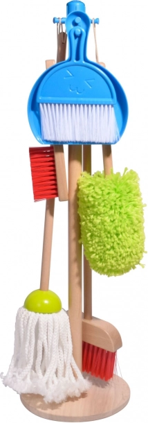 - Escoba grande, mocho, plumero, cepillo pequeño con mango, recogedor y pala de plástico, soporte de madera