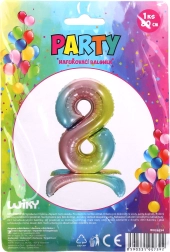Elegante globo de foil con forma de número 8 y efecto arcoíris, ideal para cumpleaños, aniversarios y fiestas temáticas. Gracias a sus colores llamativos y gran tamaño, funciona como decoración ingeniosa y accesorio fotogénico para cualquier fiesta.