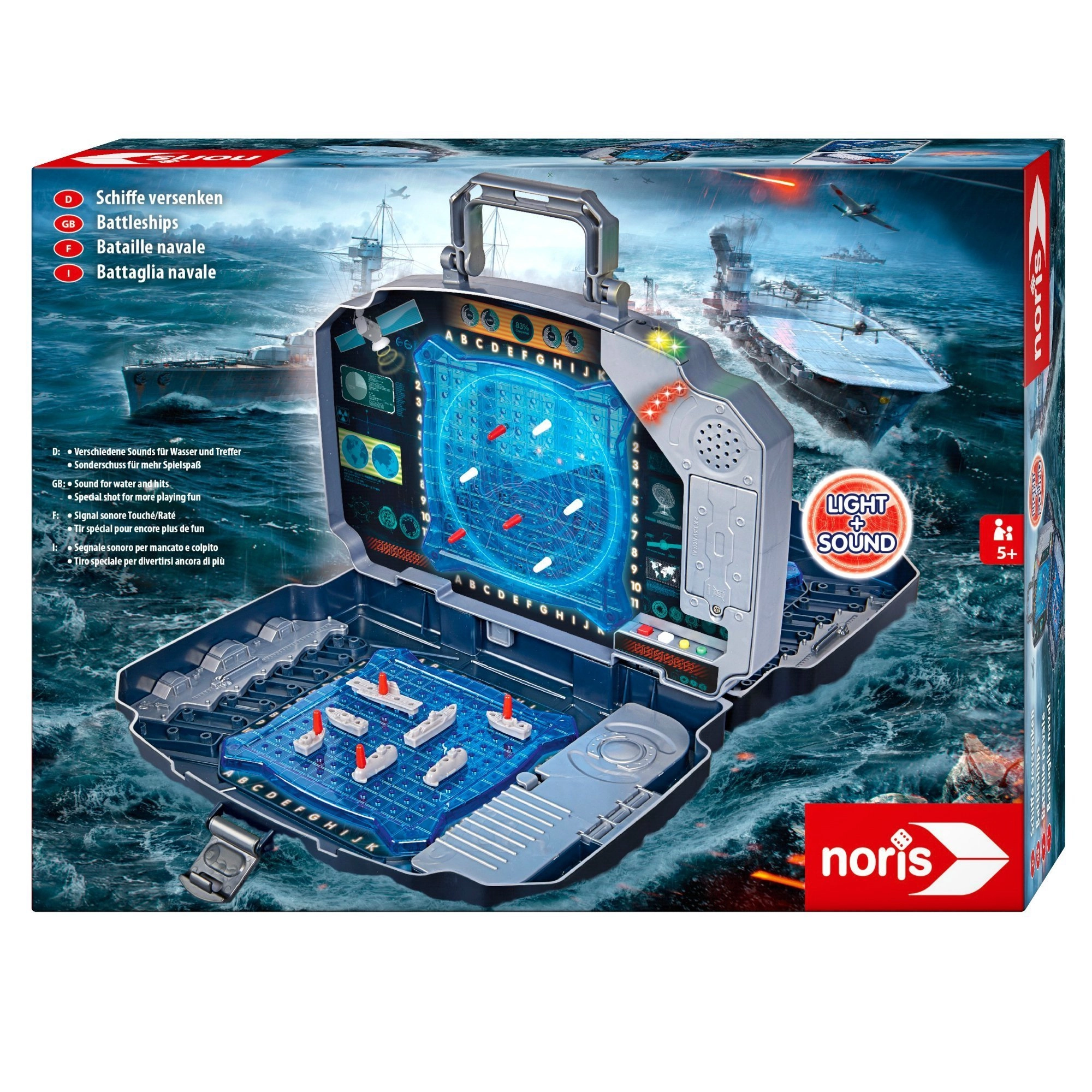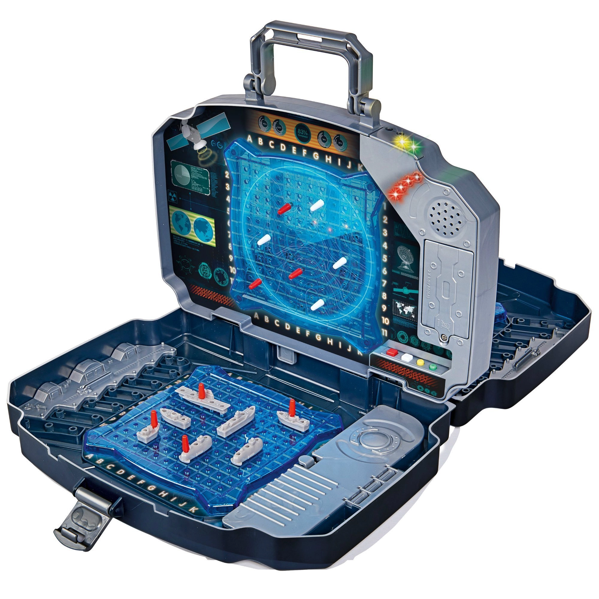 Disfruta del clásico juego Batalla Naval en una versión moderna. El robusto maletín grafito alberga dos rejillas azules para colocar los barcos y un panel central para marcar los disparos al oponente. Los efectos de luz y sonido integrados indican claramente aciertos y fallos, haciendo el juego claro, emocionante y divertido para toda la familia.