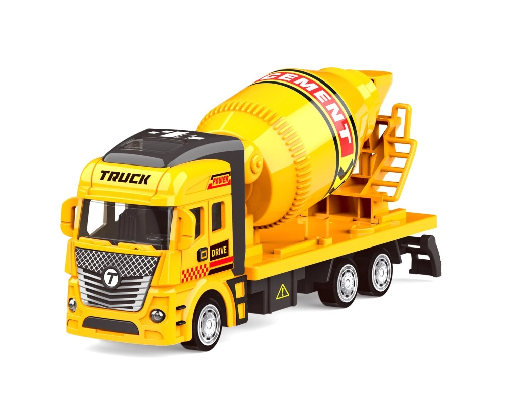 La hormigonera de obra con el texto CEMENT y un llamativo color amarillo aporta dinamismo y autenticidad al juego: el complemento perfecto para la flota de construcción.