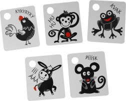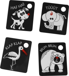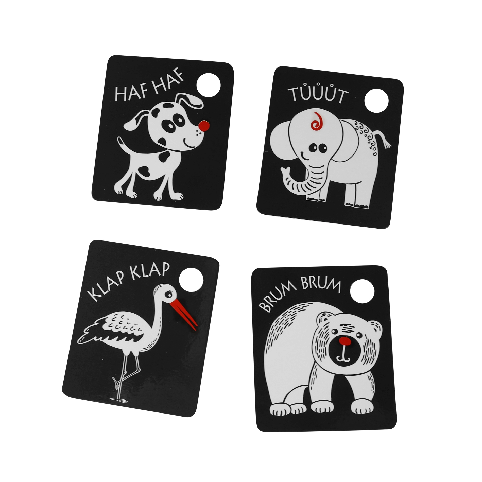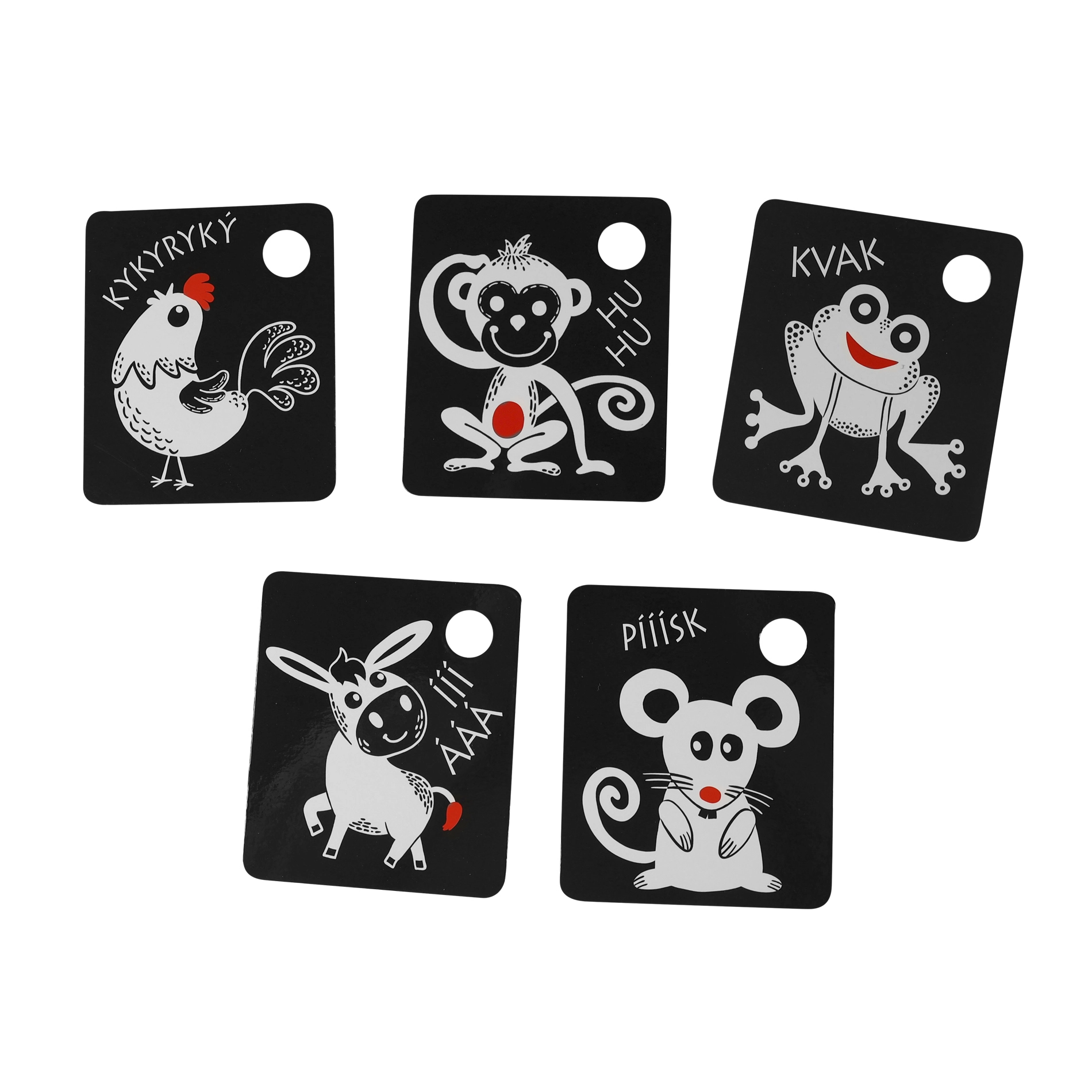Apoya el desarrollo temprano de tu bebé con tarjetas de alto contraste que estimulan la vista y la atención. El set incluye 9 tarjetas rígidas de materiales checos, con orificio para colgar y un aro de plástico para unirlas fácilmente. Las tarjetas desarrollan la estimulación visual, la motricidad fina y el reconocimiento de animales.