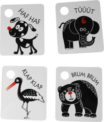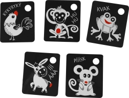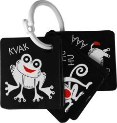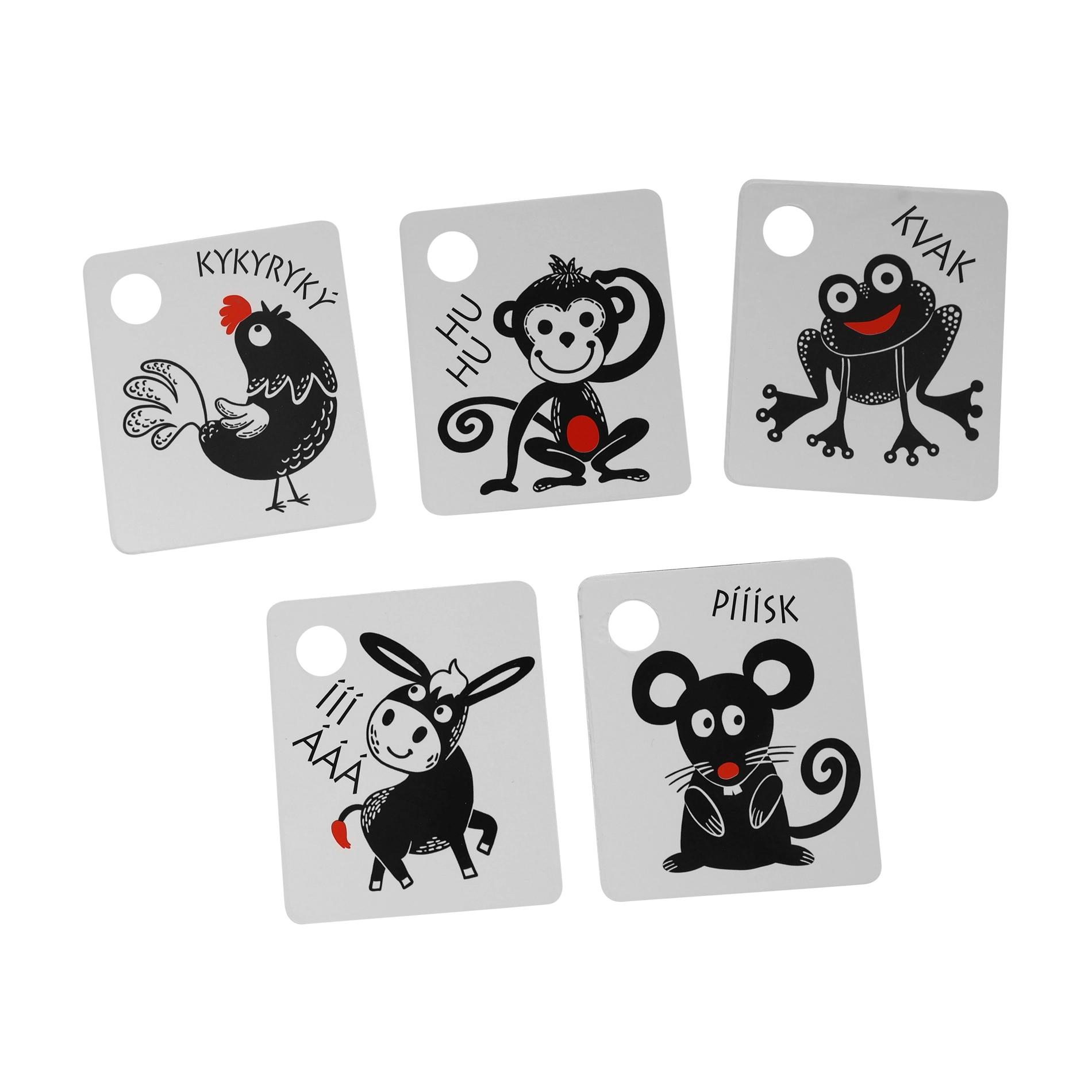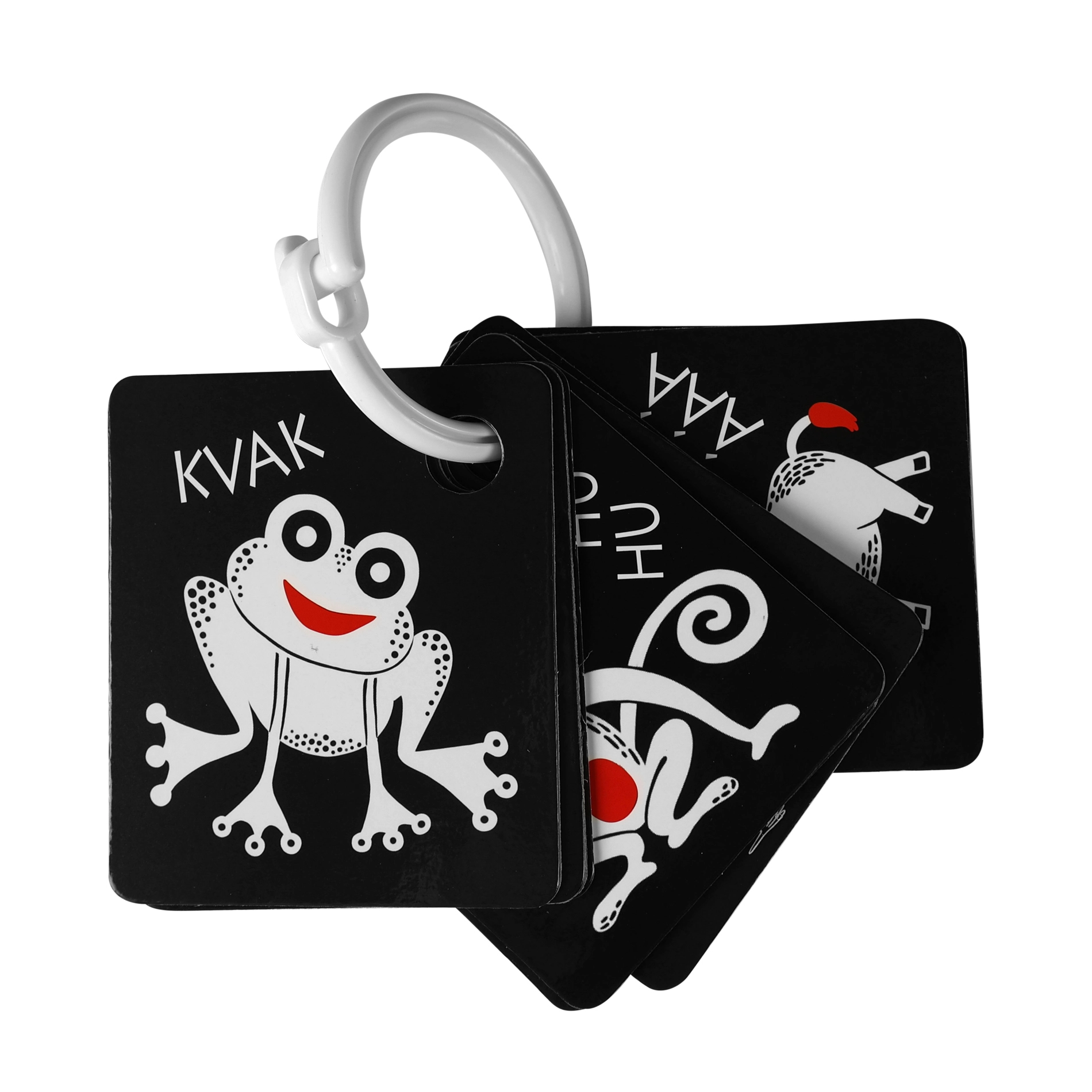 Cada tarjeta tiene un práctico orificio para colgar en la cuna, el cochecito o el arco de actividades, y el paquete incluye un resistente aro de plástico para unir fácilmente todo el set. Los materiales checos de calidad garantizan una larga vida útil y un uso seguro.