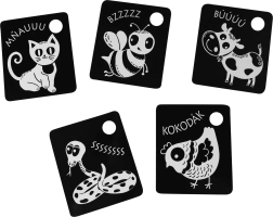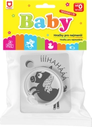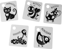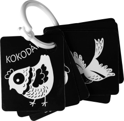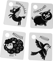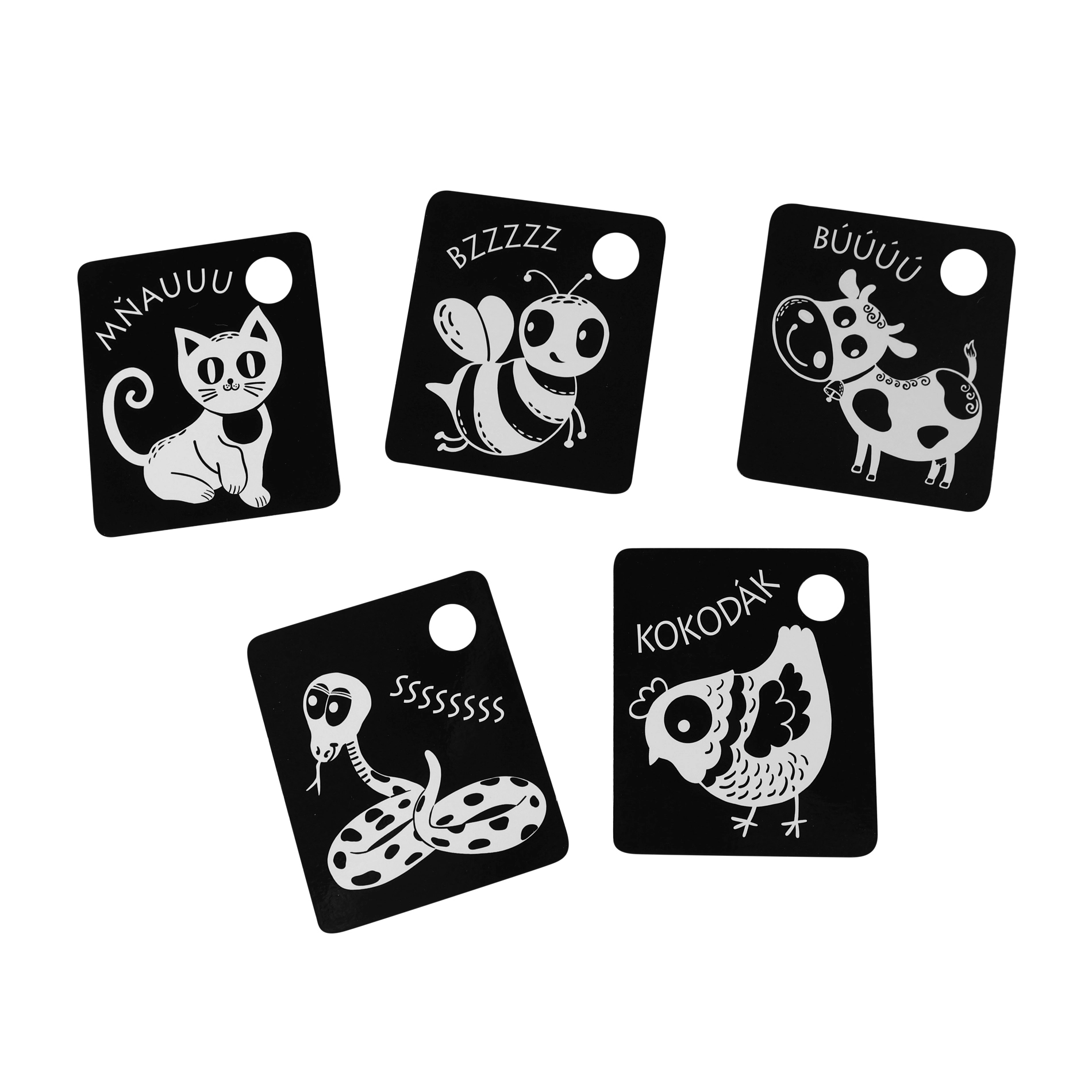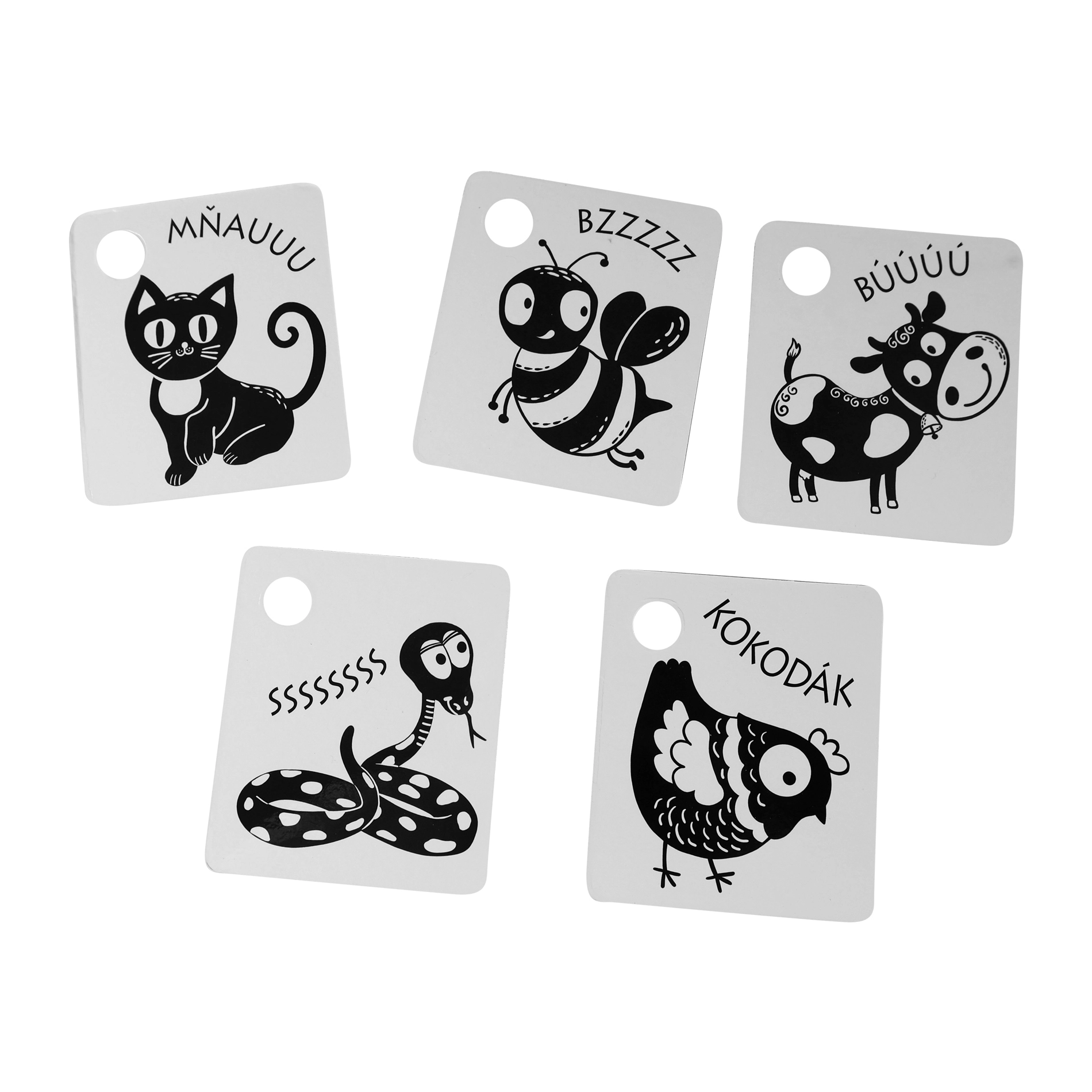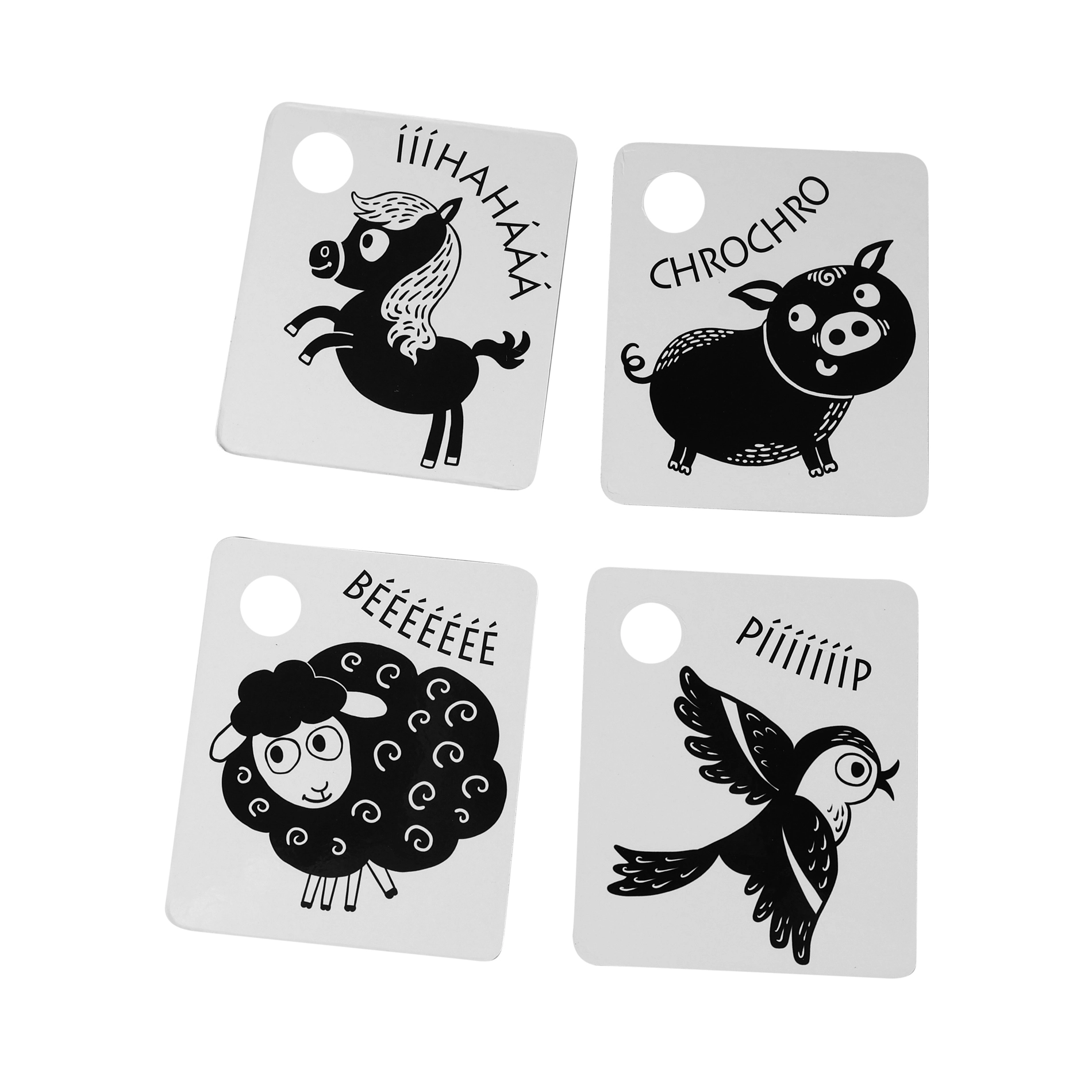 Apoya el desarrollo de tu bebé con tarjetas contrastadas en blanco y negro, presentadas en sets de 9 piezas hechas con materiales checos de calidad. Cada tarjeta cuenta con un orificio para colgar y el paquete incluye un aro de plástico para unirlas fácilmente. Las tarjetas estimulan la visión, desarrollan la motricidad fina y la curiosidad natural de los niños, incluyendo el reconocimiento de animales.
