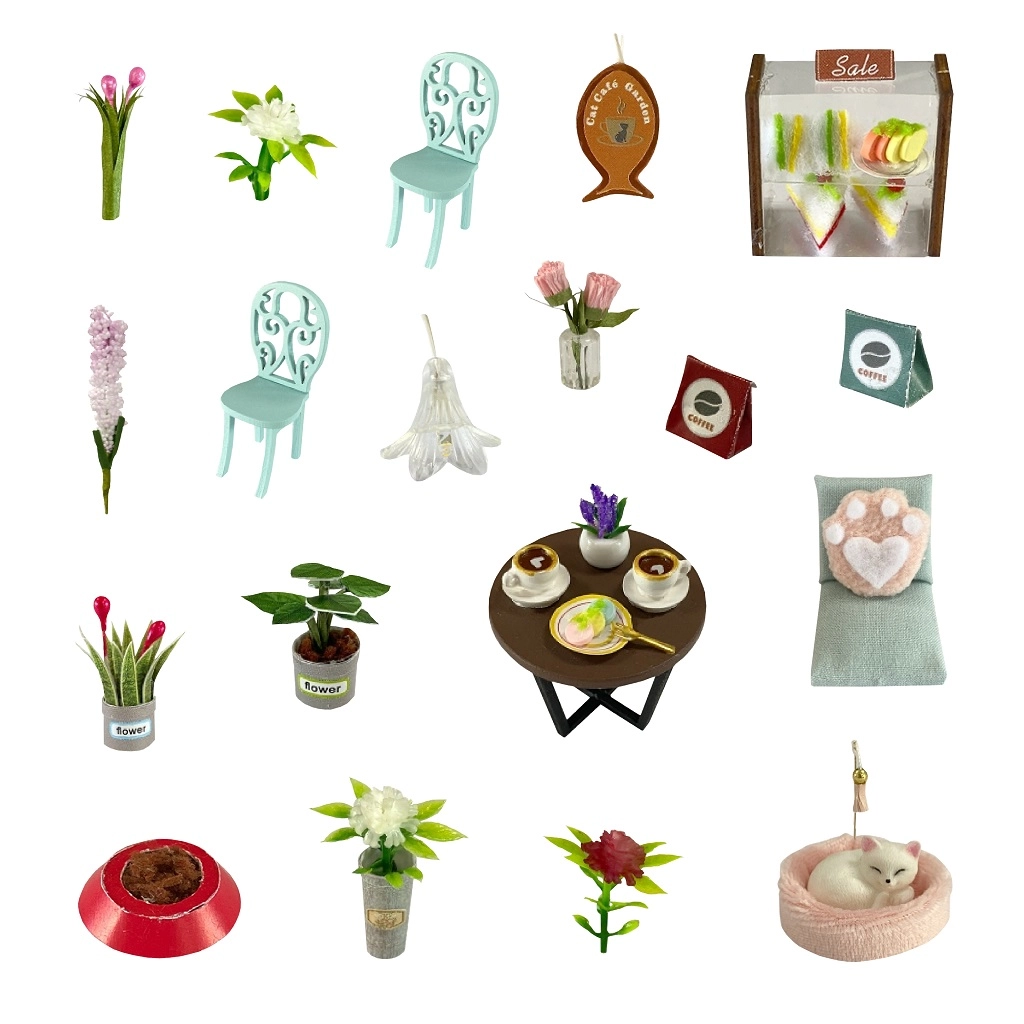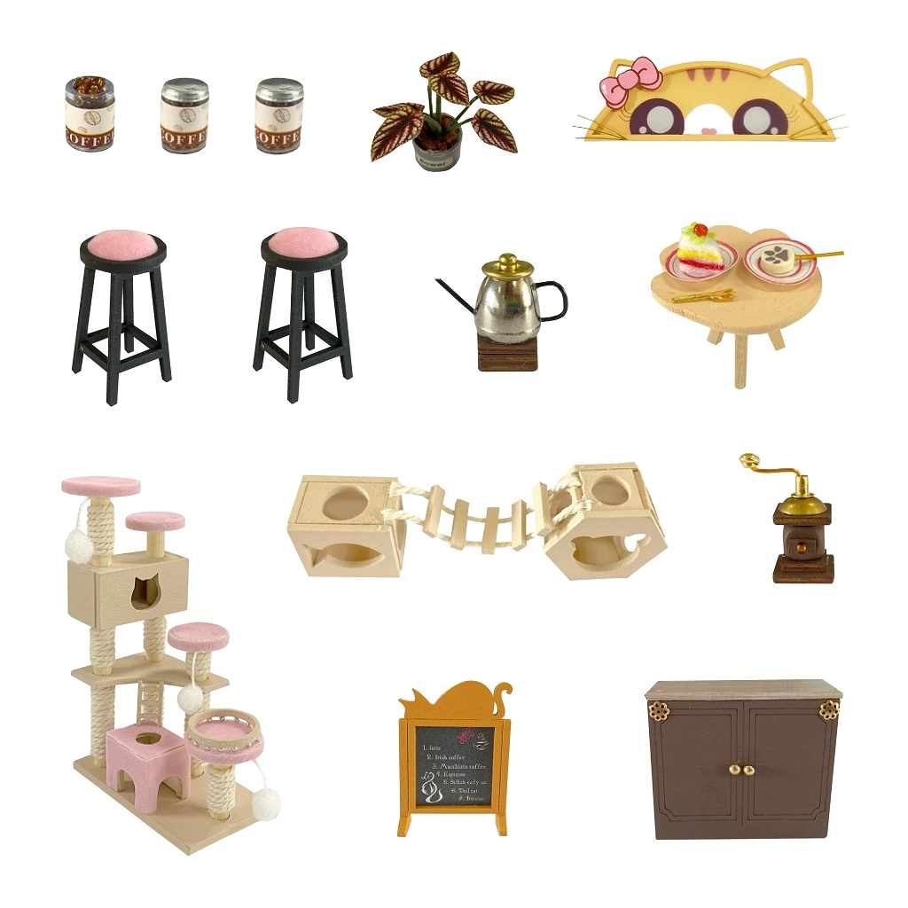 Mobiliario en miniatura, barra, mesitas y decoraciones gatunas crean la atmósfera auténtica del pequeño CAT & COFFEE. Cada elemento está cuidadosamente pensado y armonizado en color.