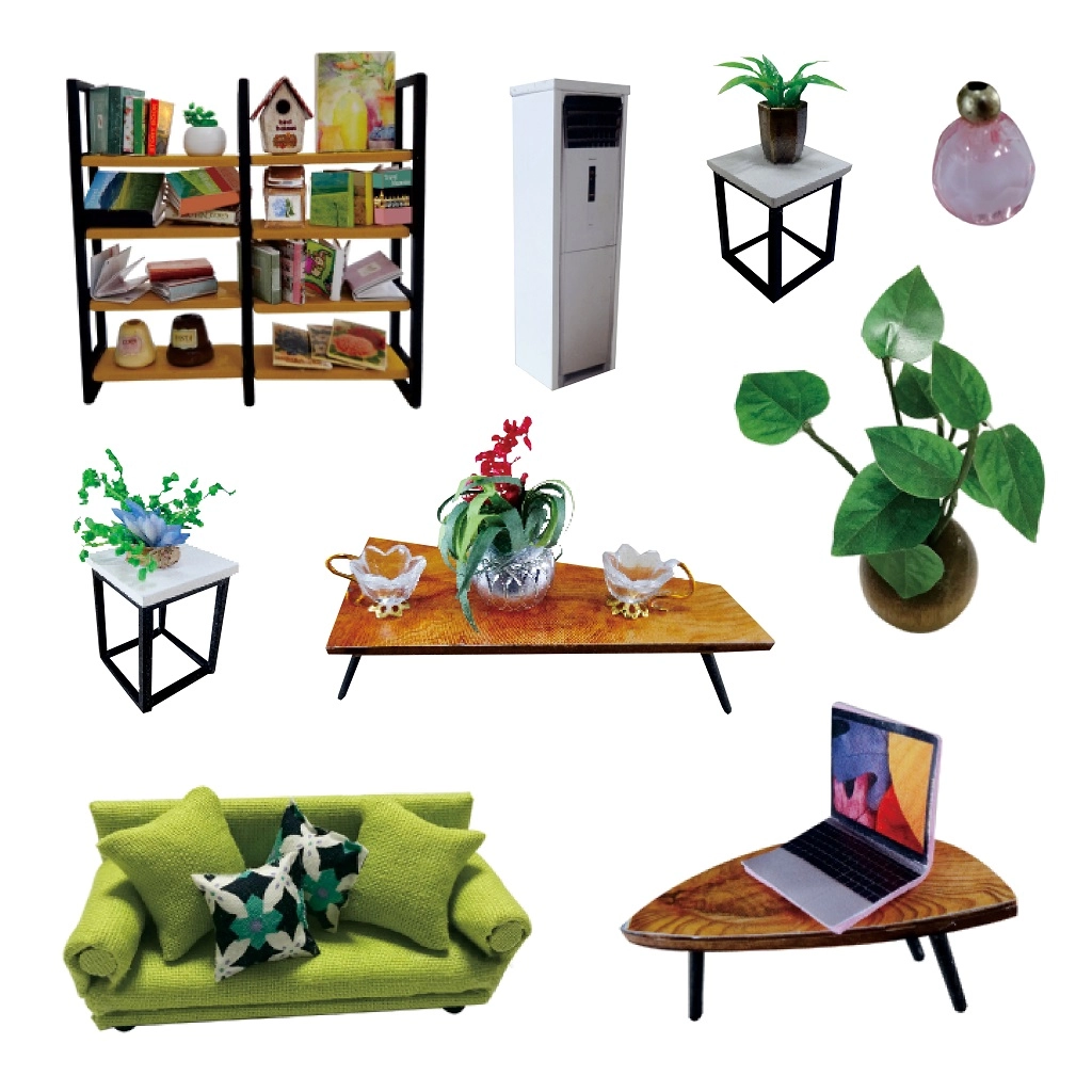 Ensambla muebles como en una casa real, desde el sofá verde hasta la mesa de centro de madera.