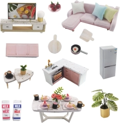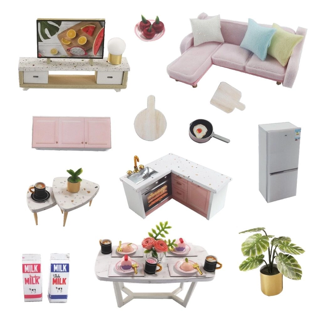 Zona de estar, comedor, cocina y dormitorio con muebles y decoraciones en miniatura crean un conjunto convincente e impactante.