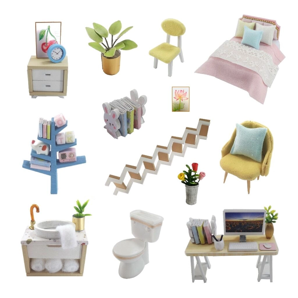 Cama, sillones, escritorio, plantas y otros accesorios de madera y plástico para decorar el interior de forma creativa.