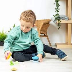 Apilar y clasificar las piezas desarrolla el agarre, la coordinación mano–ojo y la concentración. Actividad ideal para niños desde 1 año.