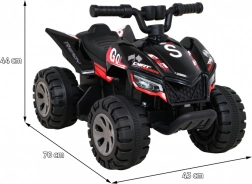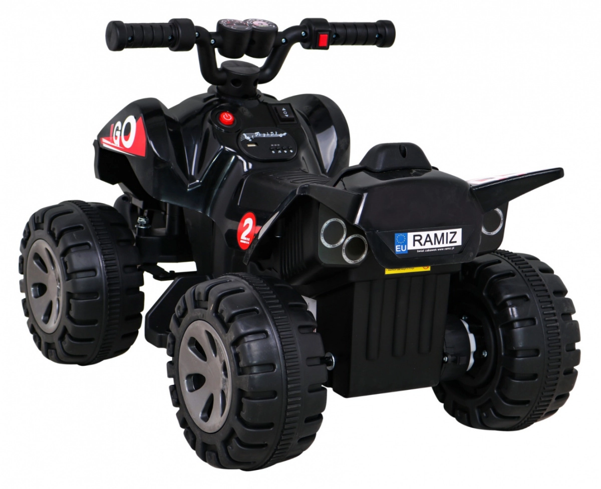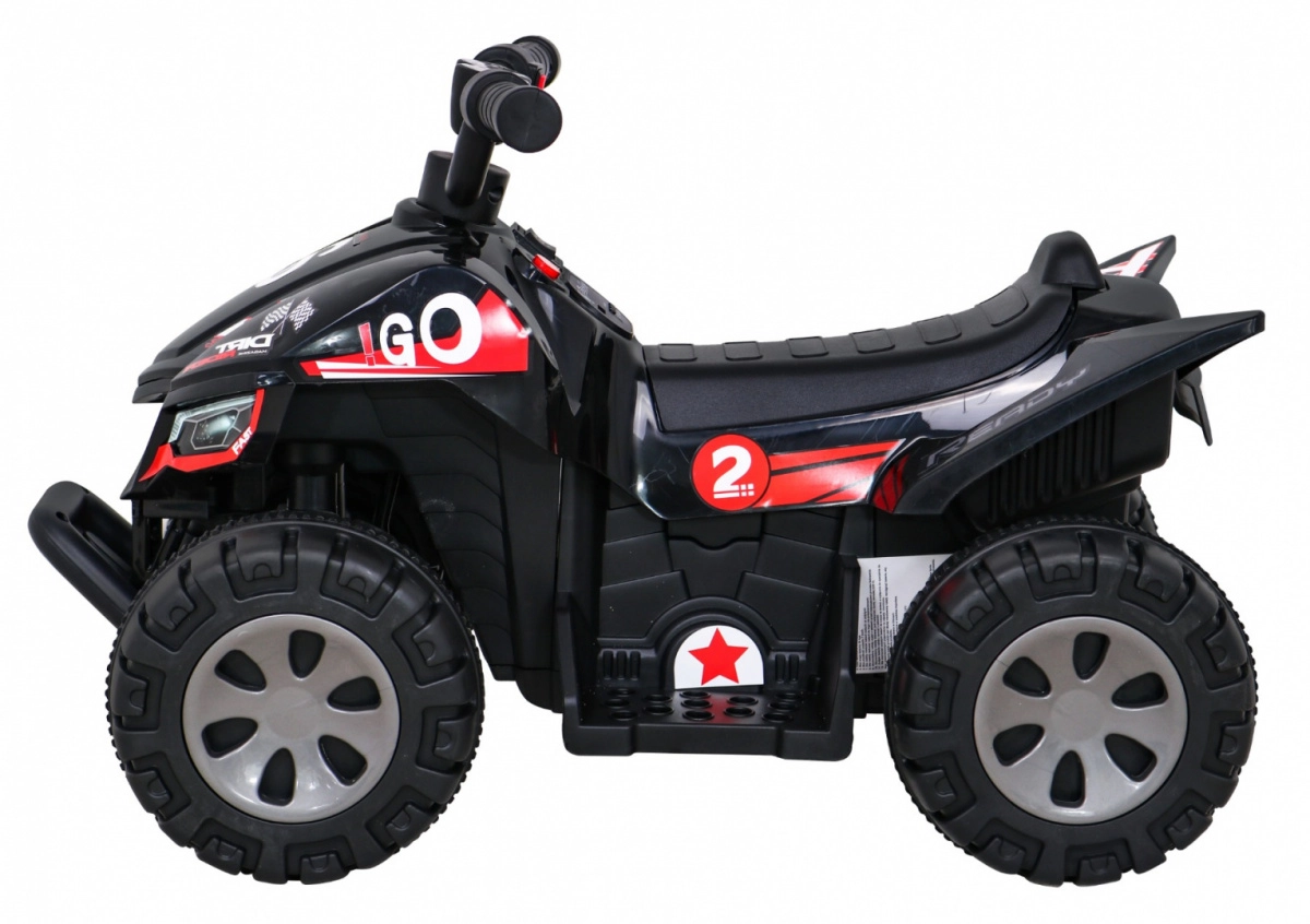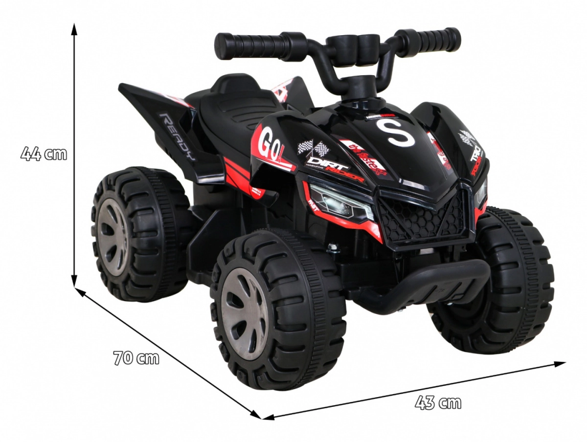 Quad infantil ligero y resistente con batería que ofrece una conducción divertida para pequeños aventureros. Gracias al motor de 25 W, la batería de 6 V / 4,5 Ah y el sencillo control mediante botón de acelerador en el puño, es ideal para las primeras experiencias con vehículos eléctricos. La estructura estable, las ruedas de plástico de 20 × 10 cm y la capacidad de carga de hasta 30 kg garantizan una conducción segura en casa y al aire libre.