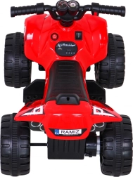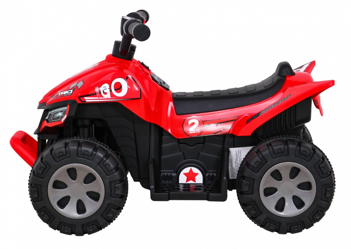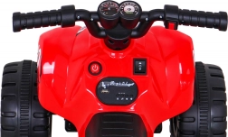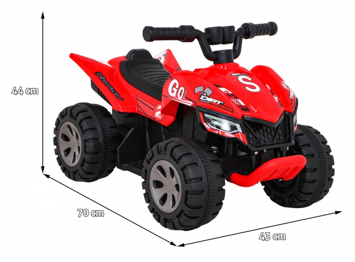 Este quad infantil THE FASTEST en color rojo es una excelente elección para los pequeños conductores. Ofrece un manejo sencillo mediante botón de acelerador en el puño, conducción hacia adelante y hacia atrás y un asiento cómodo de 26 × 13 cm. Su bajo peso de 5,5 kg y la distancia al suelo de 7 cm lo convierten en la máquina ideal para superficies lisas en casa y en el jardín.