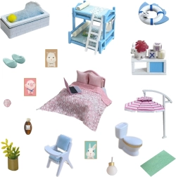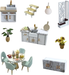 Sofá cómodo, sillón colgante, mesa elegante e incluso un adorable gatito con rascador: cada pieza está diseñada con precisión para un aspecto interior realista.