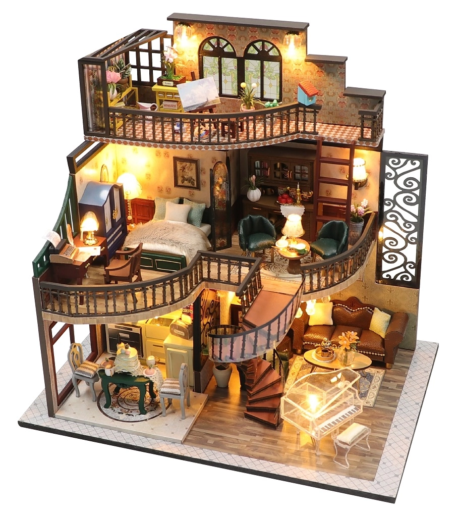 En el paquete encontrarás un conjunto completo de piezas, instrucciones paso a paso y accesorios básicos para el montaje (p. ej., pegamento, regla, pinzas). El modelo se suministra desmontado y es un regalo estupendo para cualquiera que ame los proyectos DIY y los mini mundos detallados.