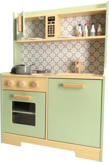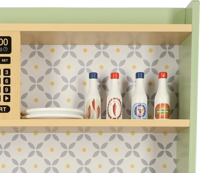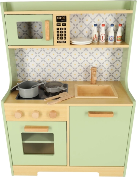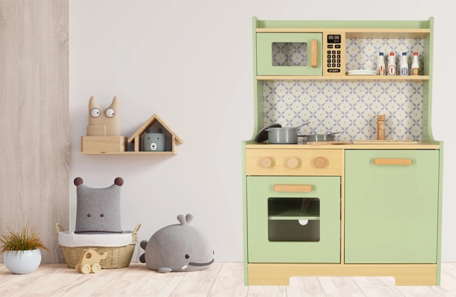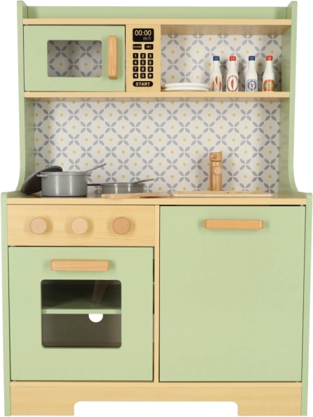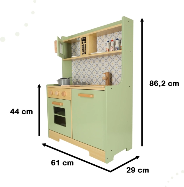 Permita que los niños imiten a sus padres en un entorno seguro con la cocina de madera verde menta. Incluye todos los elementos esenciales como horno, microondas, cocina con mandos móviles y fregadero, que emiten sonidos realistas para que la simulación de cocina sea lo más verosímil posible.