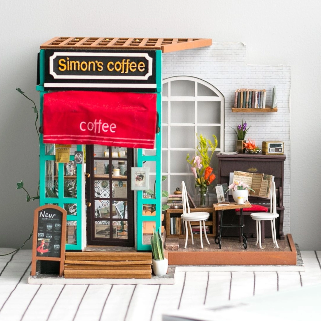 Descubre el mundo de las maquetas creativas, donde cada pieza cobra vida con tus propias manos. La mini cafetería destaca por su completo equipamiento, texturas auténticas y luz LED que crea una atmósfera agradable. Ideal como regalo para mentes creativas y como una decoración con estilo para el hogar.