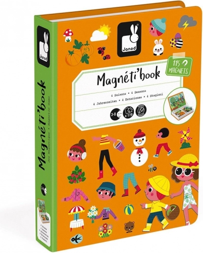 El libro magnético Janod Magnetibook – estaciones del año desarrolla la imaginación, el pensamiento lógico y la motricidad fina. Los niños, siguiendo las tarjetas, componen escenas de cada estación y eligen la ropa y los accesorios adecuados. Gracias a su diseño compacto en forma de libro, es ideal para viajes, en el coche y para visitas.
