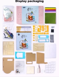 El kit se suministra desmontado e incluye todas las herramientas necesarias, incluido pegamento, pinturas y pincel. Durante el montaje se trabaja principalmente con piezas ya cortadas de contrachapado, elementos de cartón y de tela. Para una instalación cómoda de la iluminación recomendamos usar alicates de punta redonda, aunque unas tijeras comunes también son suficientes.