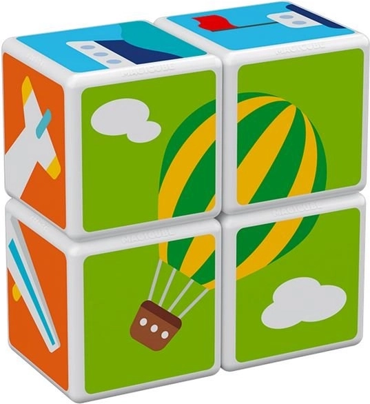 GEOMAG Magicube Printed Transport es un ingenioso juego de construcción magnético que combina juego y aprendizaje. Cuatro cubos impresos con motivos de transporte y tres tarjetas a doble cara invitan a los niños a componer coches, aviones, cohetes y otras imágenes. Gracias a los imanes que funcionan en cada arista, la construcción es intuitiva y segura.