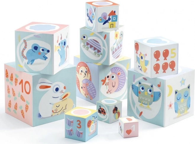 Este set incluye 10 cubos que se pueden apilar uno sobre otro hasta una altura de 89 cm. El cubo más grande mide 15 x 15 x 15 cm.