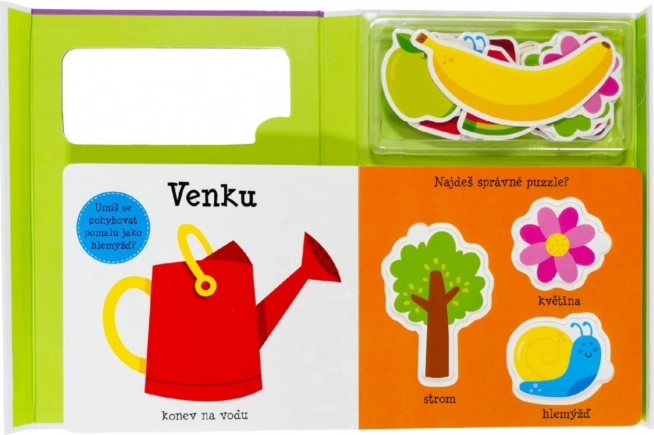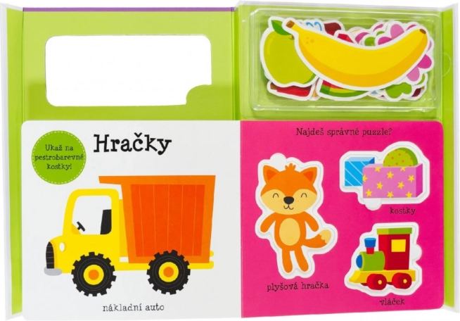 Este estuche es una opción perfecta para los más pequeños que aprenden palabras nuevas y mejoran su motricidad fina. El libro alegremente ilustrado muestra a los niños el mundo de las palabras básicas, los colores, las frutas y los animales. Además: